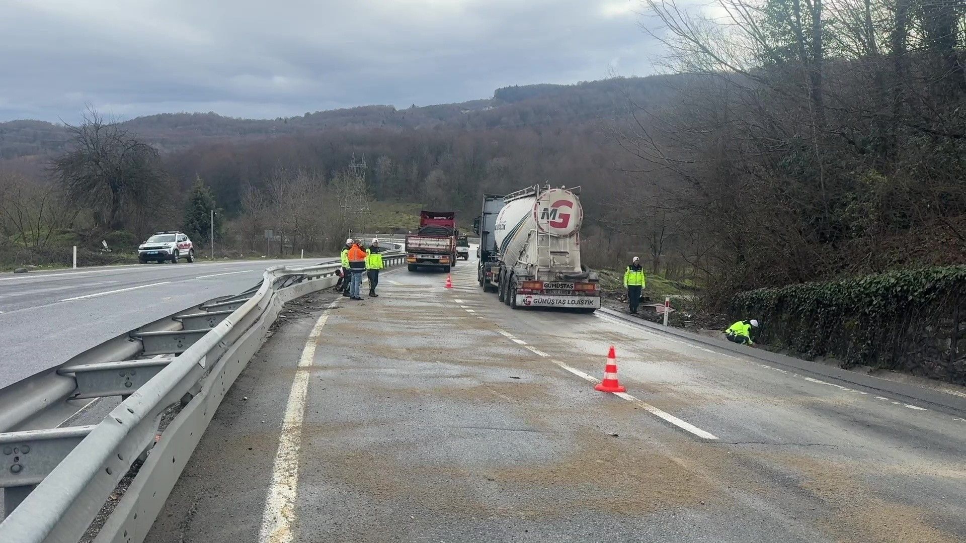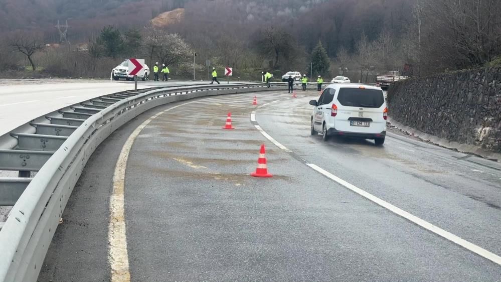Düzce-Akçakoca D-655 kara yolunda sağanak yağışın ardından kayganlaşan zeminde kontrolden çıkarak bariyerlere çarpan tır yolu trafiğe kapattı. Makas atarak durabilen tırın hafif yaralanan sürücüsüne olay yerinde müdahale edilirken, kara yolunda uzun araç kuyrukları oluştu.
