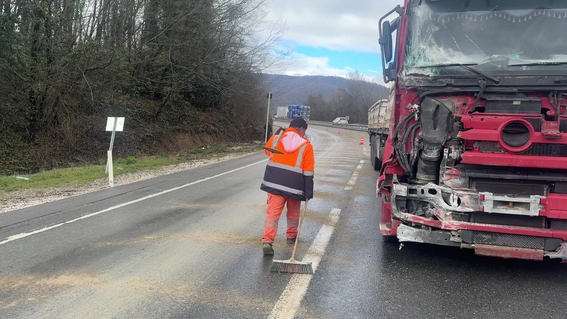 Sabah saatlerinde D-655 kara yolu Kurtsuyu mevkiinde Düzce’den Akçakoca istikametine seyreden M.C.Ç. idaresindeki 80 AAH 672 plakalı tır rampa inişinde yağışın da etkisiyle kayganlaşan yolda kontrolden çıktı. Sürücüsünün direksiyon hakimiyetini kaybettiği ağır vasıta virajı alamayarak önce yol kenarındaki beton su kanalına, ardından savrularak sol taraftaki bariyere çarptı. Çarpmanın şiddetiyle makas atan tır, kara yolunun iki şeridini birden trafiğe kapattı. Yoldan geçen diğer sürücülerin durumu 112 Acil Çağrı Merkezi’ne bildirmesi üzerine bölgeye jandarma, sağlık ve Karayolları ekipleri sevk edildi.