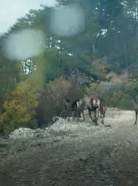 Bolu'nun Göynük ilçesinde orman yolunda gezen geyik sürüsü, bir vatandaşın cep telefonu kamerasıyla görüntülendi.