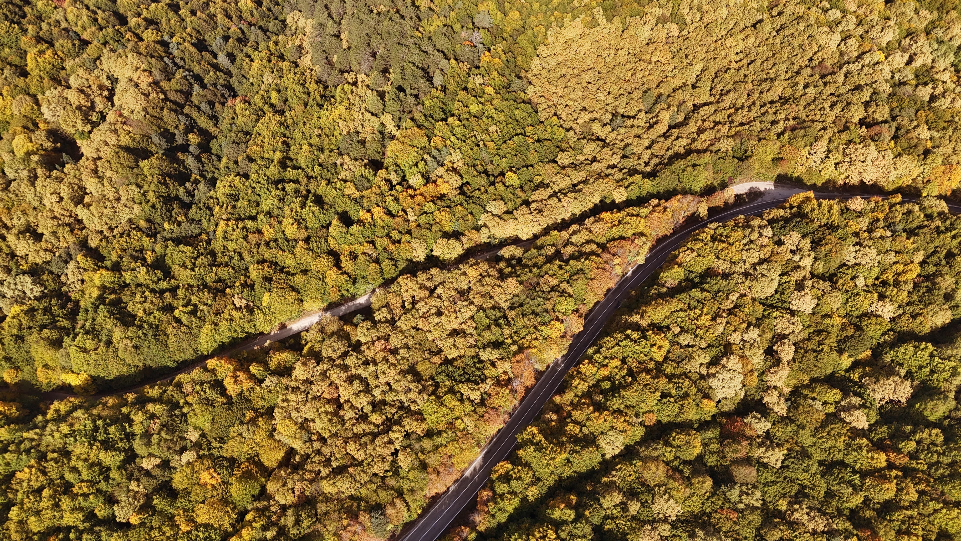 BOLU'da, sonbaharın gelmesiyle birlikte Bolu-Seben-Kıbrıscık kara yolundaki yeşil ormanlarda sararan yaprakların oluşturduğu eşsiz manzara dron ile görüntülendi.