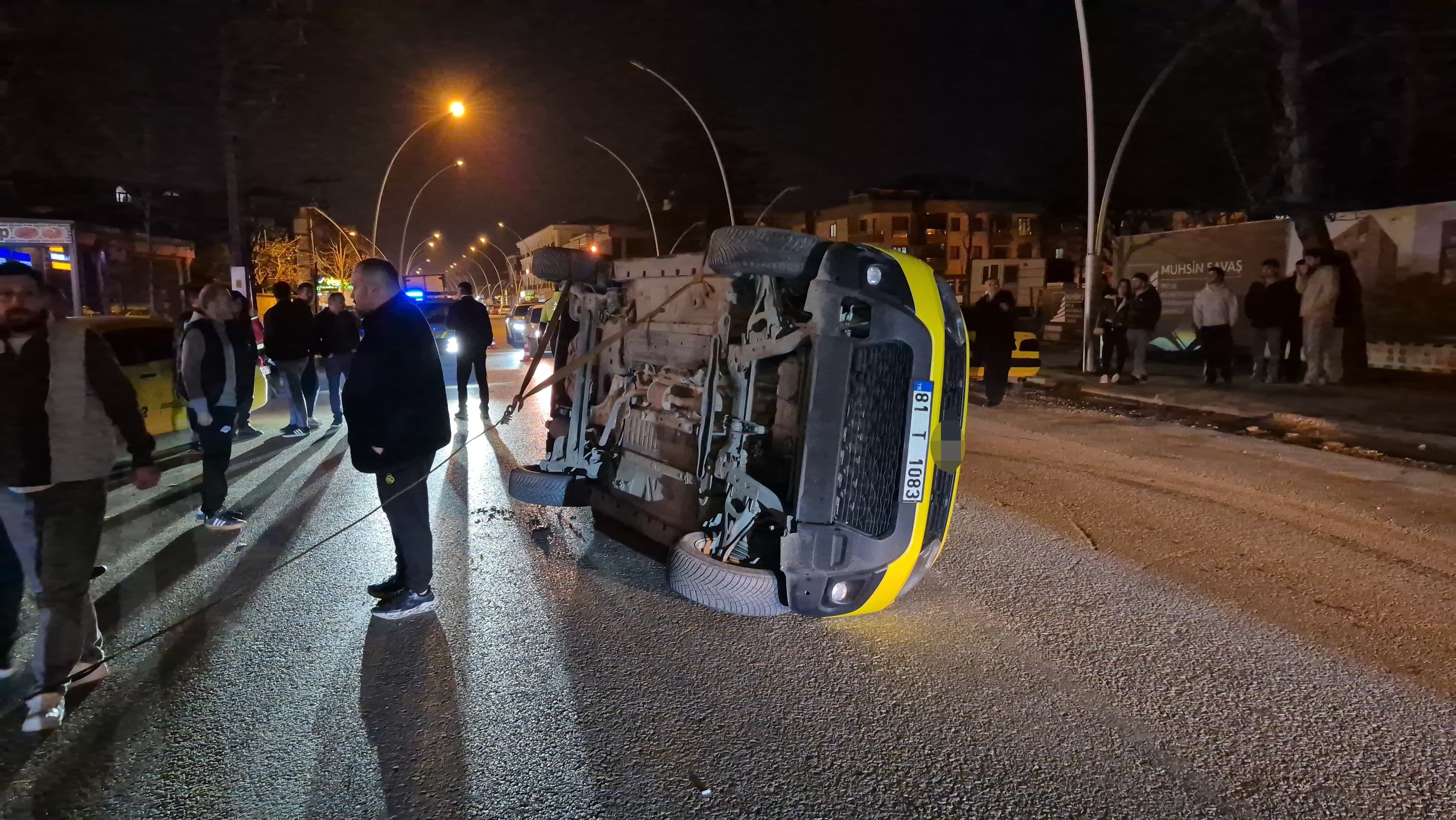 Düzce’de sıkışan trafikte ilerlemeye çalışan ticari taksi, park halindeki otomobile çarparak yan yattı. Kaza maddi hasar ile atlatıldı.