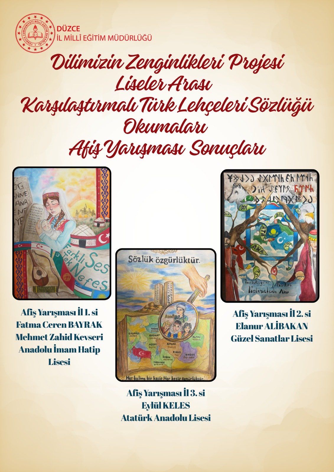 “Karşılaştırmalı Türk Lehçeleri Sözlüğü Okumaları” temalı afiş yarışmasında lise düzeyinde dereceye giren öğrenciler şöyle oldu: