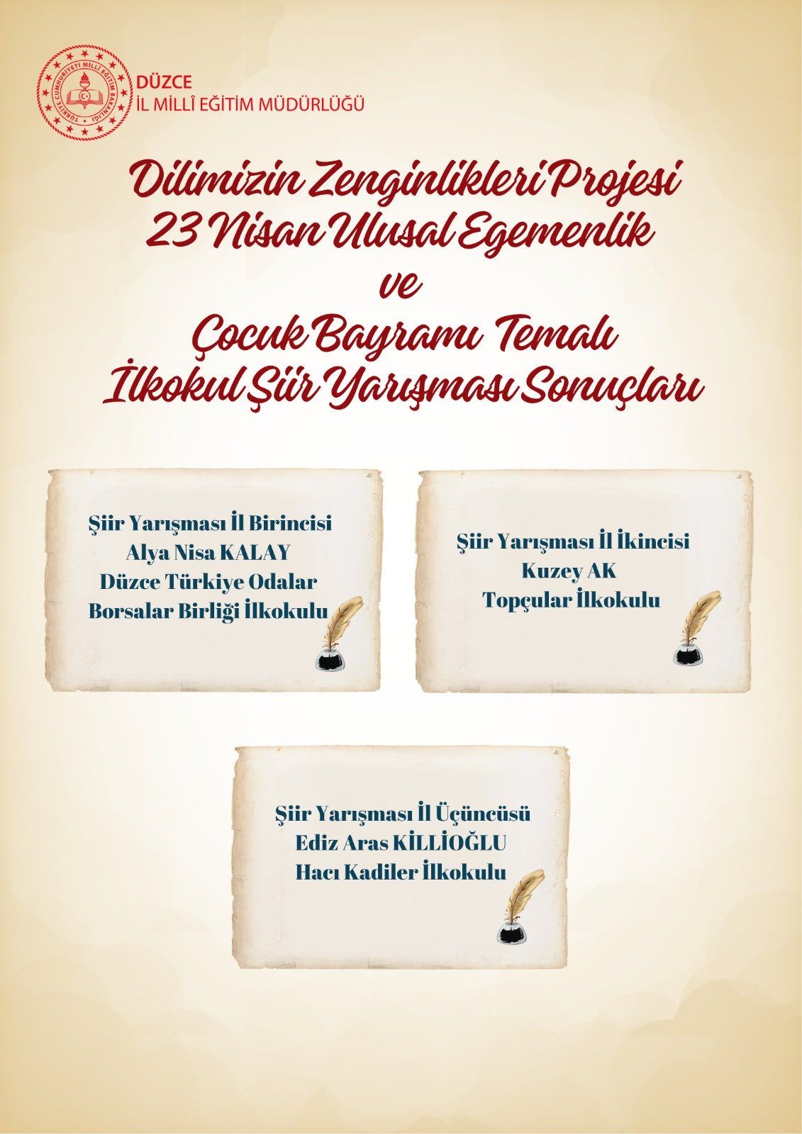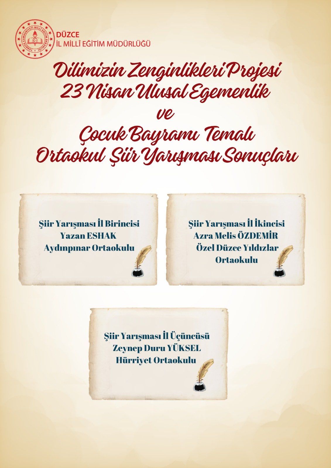 23 Nisan Ulusal Egemenlik ve Çocuk Bayramı temalı ortaokullar arası şiir yarışmasında dereceye giren öğrenciler: