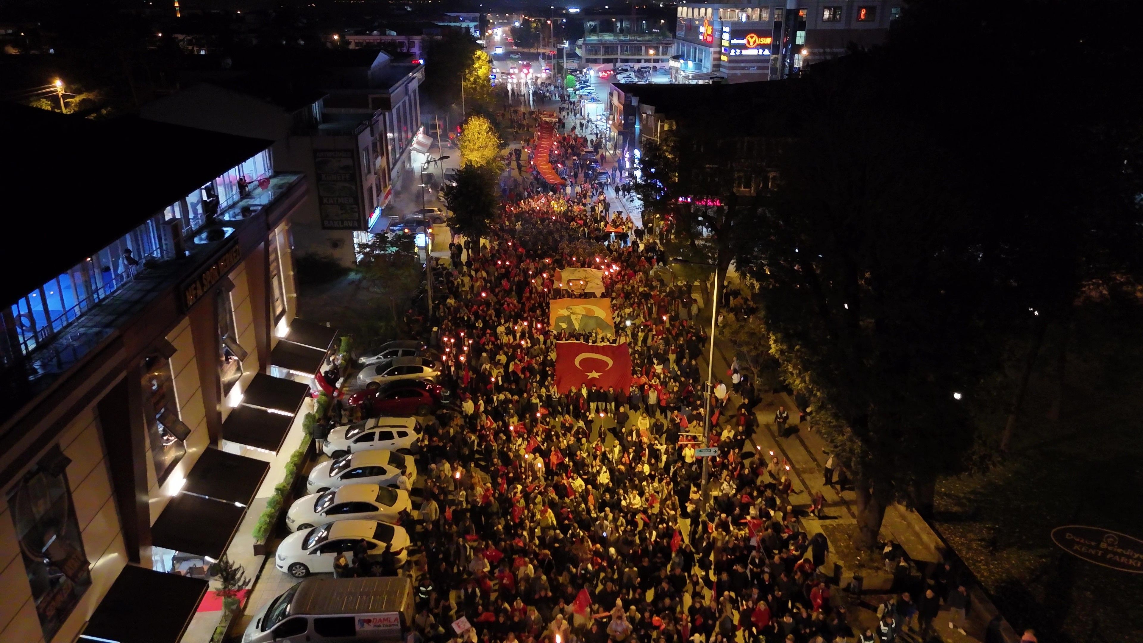 Düzce'de Cumhuriyet'in ilanının 102. yılı ve Cumhuriyet coşkusu caddelere sığmadı. Kutlamaları çerçevesinde düzenlenen fener alayı Düzcelileri sokağa döktü.