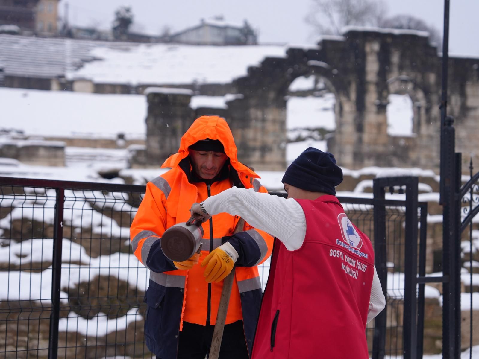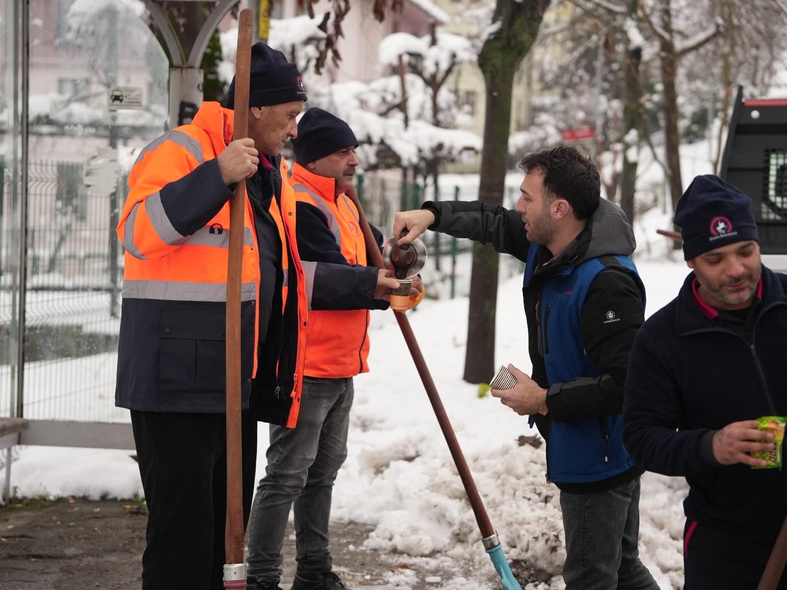 Sosyal Hizmetler Müdürlüğü, yoğun kar yağışı altında ve soğuk havada çalışan ekiplere moral vermek amacıyla sıcak çay ve kek ikramında bulunurken, ekipler de ikram sayesinde kısa bir mola vererek sıcak çay ile içlerini ısıttı.