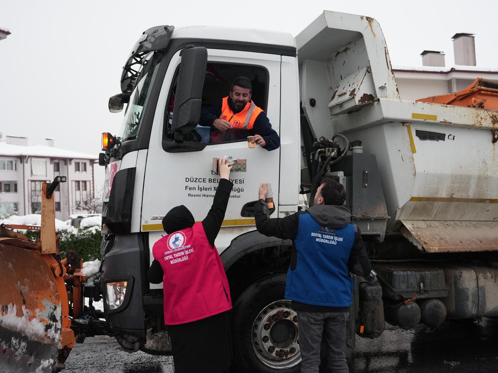 Düzce’de hafta sonundan itibaren yaşanan yoğun kar yağışı ile mücadelesini kar kürüme ve yol açma çalışmaları ile sürdüren Düzce Belediyesi karla mücadele timlerine, Sosyal Hizmetler Müdürlüğü tarafından sıcak çay ve kek ikramı yapıldı.