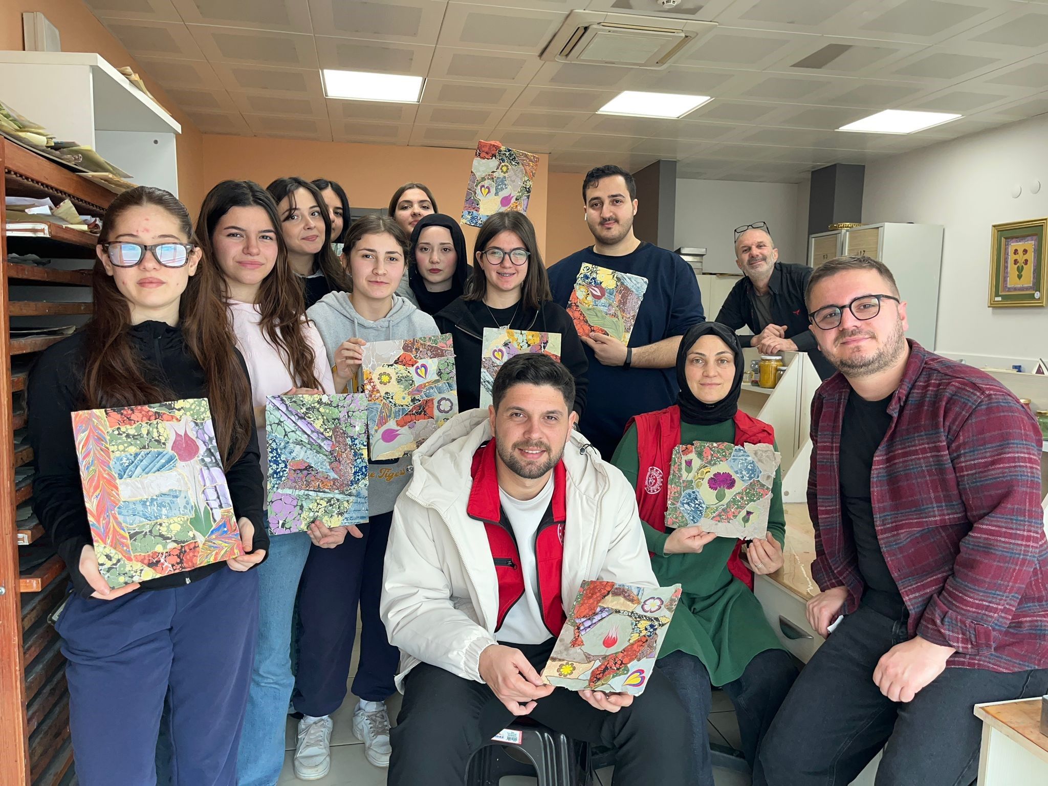Geleneksel Türk sanatları arasında önemli bir yere sahip olan ebru sanatını yakından tanıma fırsatı bulan gençler, suyun ve renklerin uyumunu keşfederek kendi özgün çalışmalarını ortaya koydu. Alanında yetkin eğitmenler eşliğinde gerçekleştirilen etkinlikte, ebru sanatının tarihçesi, kullanılan malzemeler ve uygulama teknikleri hakkında bilgilendirme yapıldı. Etkinlik süresince gençler hem sanatsal becerilerini geliştirdi hem de keyifli ve verimli vakit geçirdi.