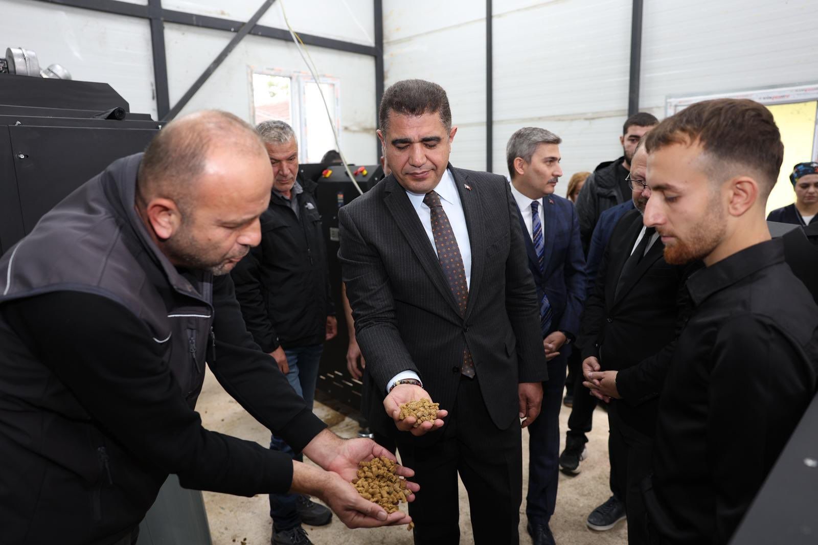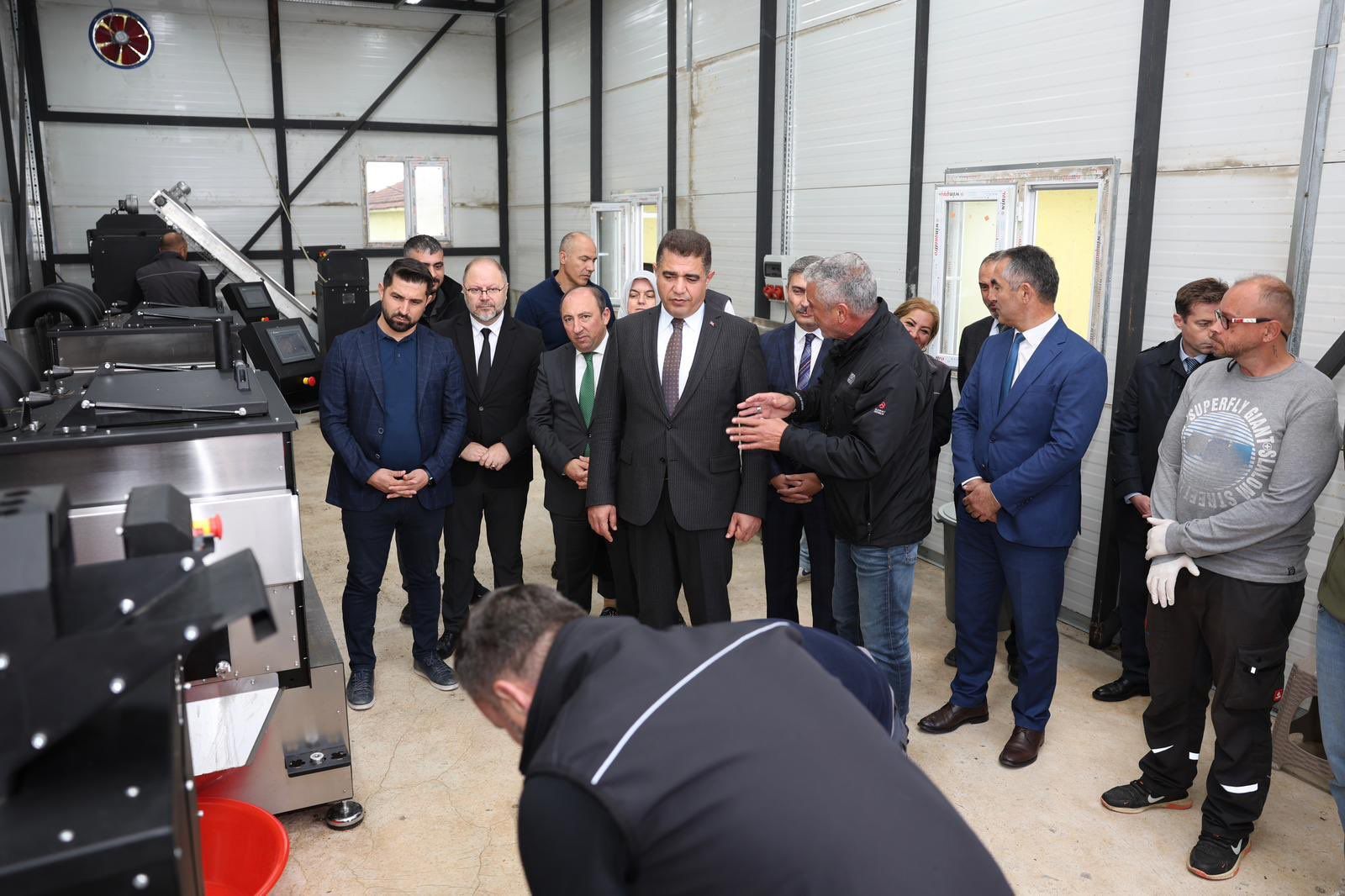 Şehirdeki yurtlar, restoranlar, fırınlar ve toplu yemek hizmeti veren işletmelerden toplanan hizmet fazlası gıdaların yeniden değerlendirilmesiyle mama üretimi yapılan tesiste incelemelerde bulunan Vali Aslan, tesisin çalışma sistemi hakkında bilgi aldı.