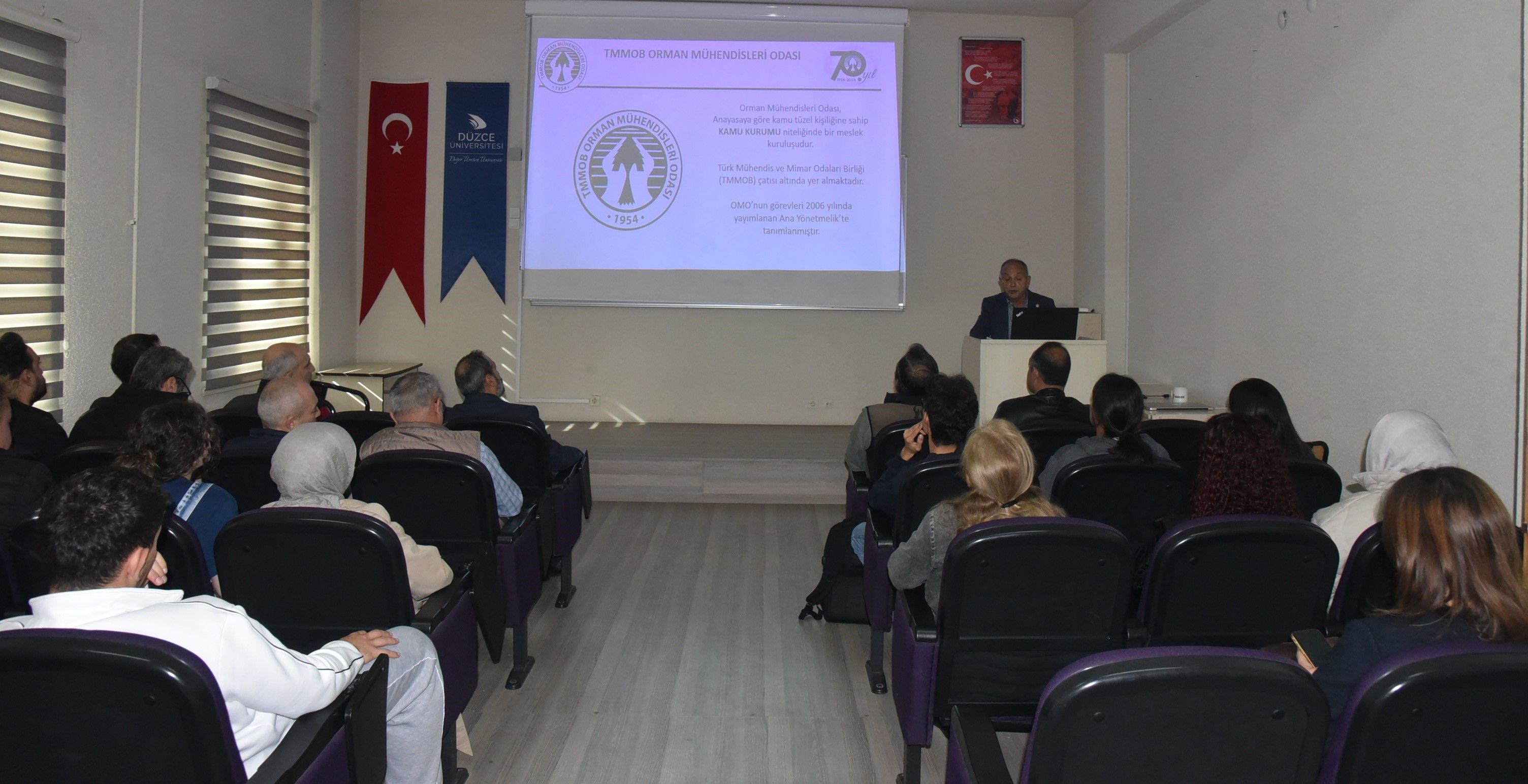 Orman Fakültesi Konferans Salonu’nda etkinliğe; Orman Fakültesi Dekan Yardımcıları Prof. Dr. Yılmaz Türk ve Doç. Dr. Halil İbrahim Şahin, akademisyenler ve öğrenciler katılım sağlarken; Orman Mühendisleri Odası (OMO) Sakarya Şube Başkanı Vedat Dilaver konuşmacı olarak etkinlikte yer aldı. Dilaver, odanın 1954 yılında Ankara’da kurulduğunu, orman mühendisi, orman endüstri mühendisi ve ağaç işleri endüstri mühendisi unvanına sahip meslek mensuplarını temsil ettiğini ifade etti. Vedat Dilaver, öğrencilerin meslekle erken bağ kurmalarının önemine vurgu yaparak odaya üye olmalarını tavsiye etti.