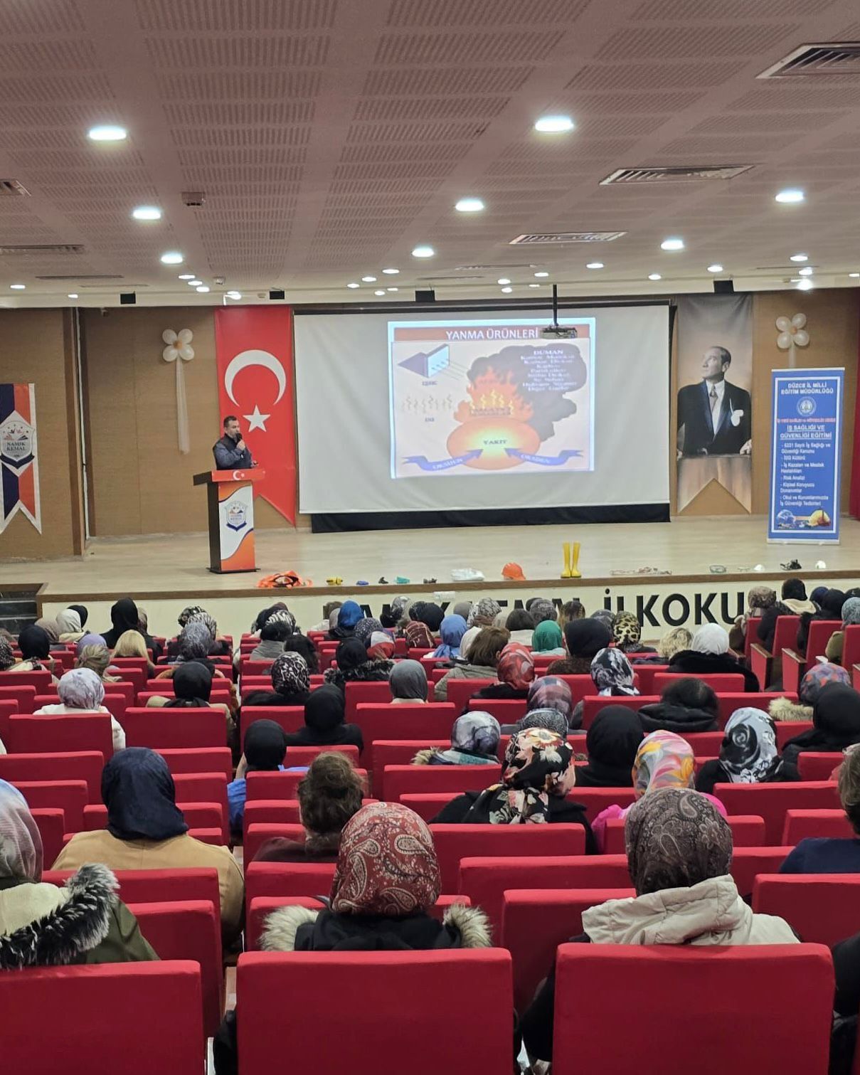 Namık Kemal İlkokulu’nda gerçekleştirilen eğitimde, iş güvenliği uzmanları tarafından iş kazaları ve meslek hastalıklarından korunma yolları, yangından korunma tedbirleri ve kişisel koruyucu donanımların doğru kullanımı gibi konular ele alındı.