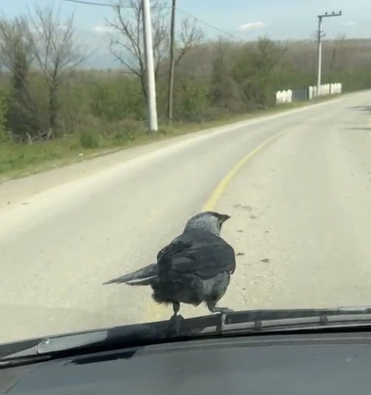 Edinilen bilgiye göre, aracıyla trafikte seyreden Hakan Çiçekoğlu'nun otomobilinin ön cam sileceğine karga kondu. Araç hareket halinde olmasına rağmen bulunduğu yerden ayrılmayan karga, silecek üzerinde kilometrelerce yolculuk yaptı. Bu durum karşısında şaşkınlık yaşayan sürücü Çiçekoğlu, o anları cep telefonu kamerasıyla kayda aldı. Bir süre sonra aracın yavaşlamasını fırsat bilen karga, bu kez açık camdan içeri girerek sürücünün omzuna kondu.