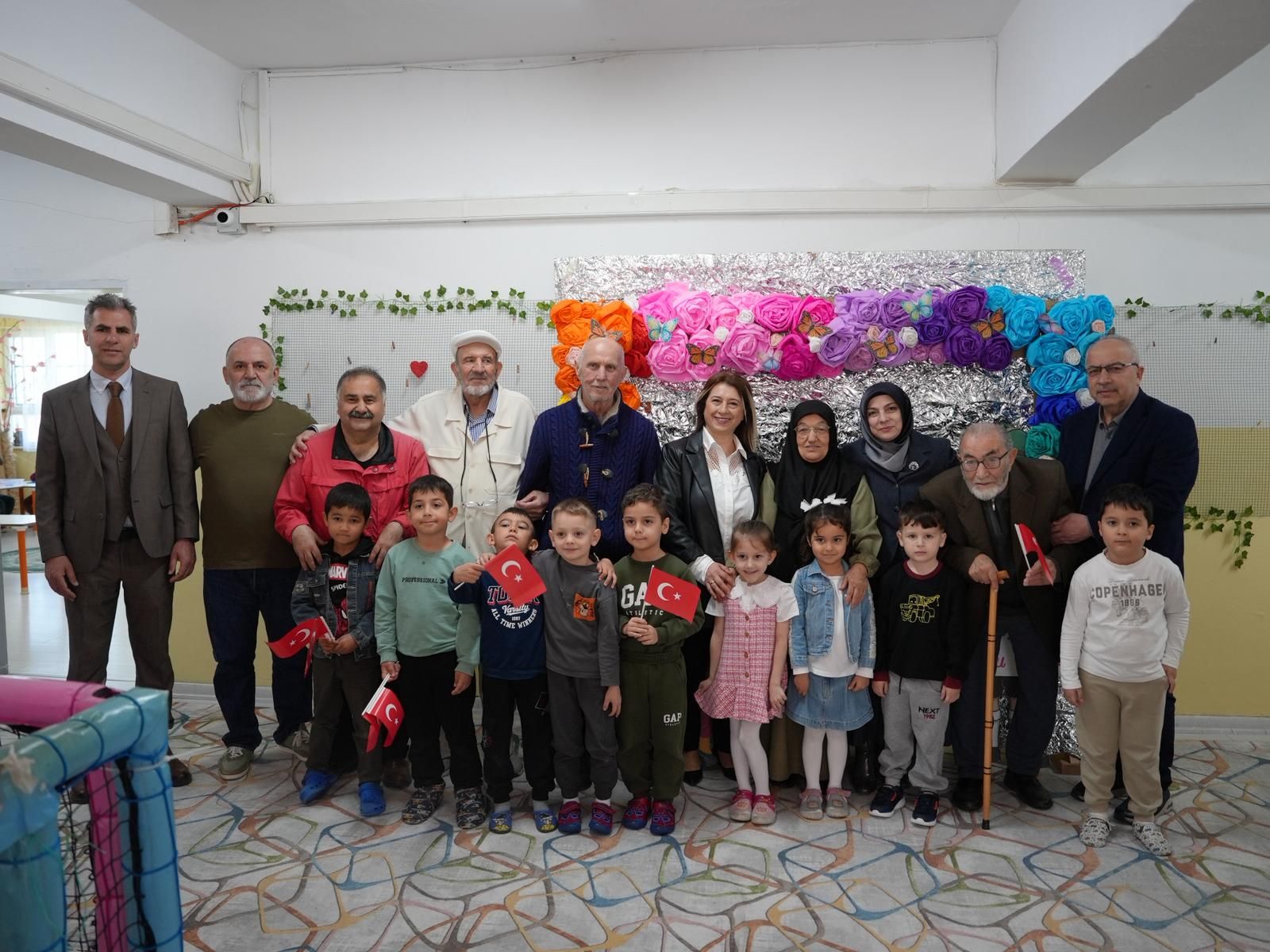 Sosyal Hizmetler Müdürlüğü tarafından organize edilen programda yaşlılar, ana sınıfı öğrencileriyle buluştu. Çocuklara, özenle hazırladıkları hediyeler ile birlikte çiçek ve Türk bayrağı veren yaşlılar, 23 Nisan Bayramı’nı kutladılar.