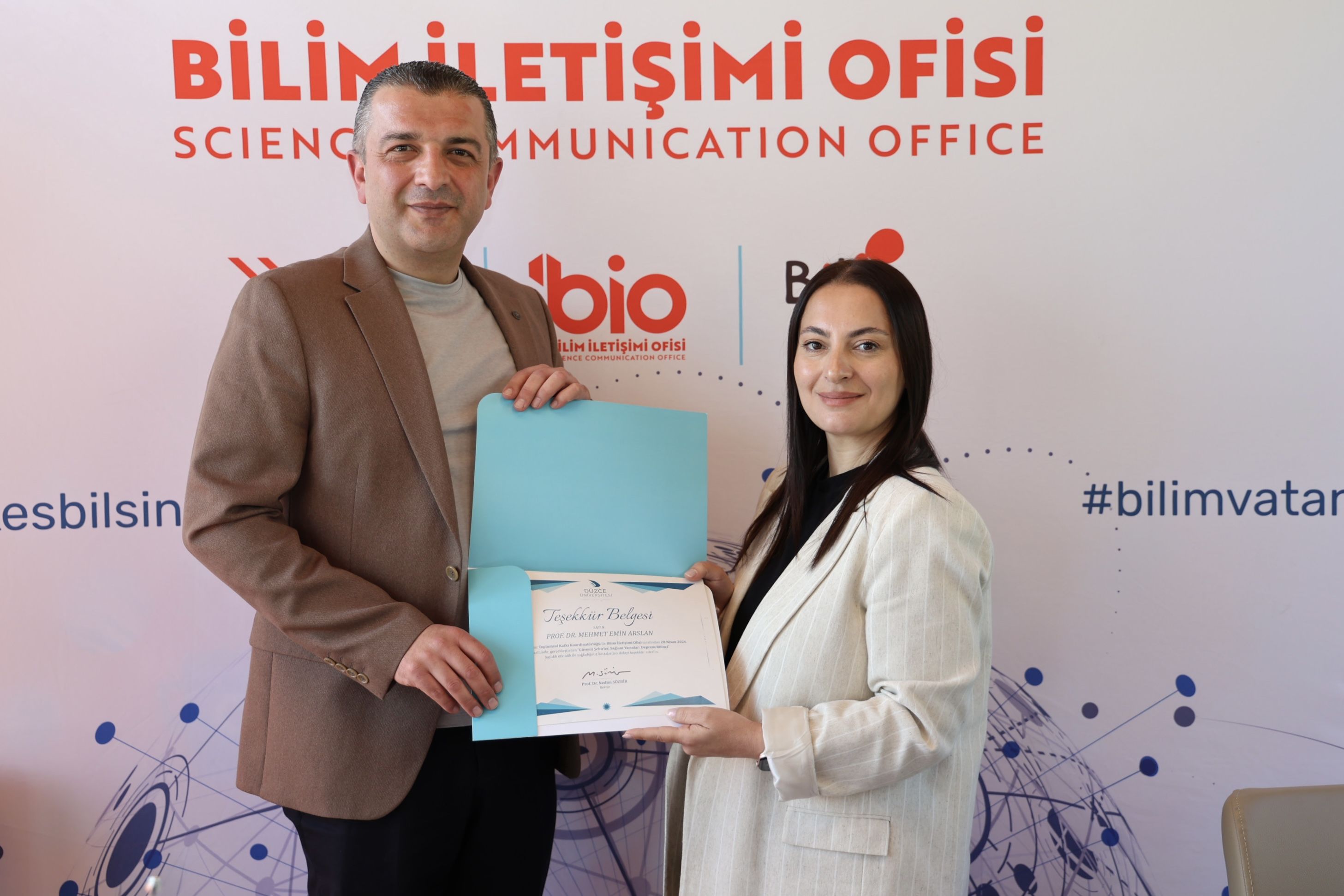 Bilim Kafe, Düzce Üniversitesi Genel Sekreter Yardımcısı ve Kurumsal İletişim Koordinatörü Öğr. Gör. Duygu Özdemir Cömert tarafından Düzce Üniversitesi Deprem Uygulama ve Araştırma Merkezi Müdürü Prof. Dr. Mehmet Emin Arslan’a teşekkür belgesi takdim edilmesi ve günün anısına hatıra fotoğrafı çekimiyle sona erdi.