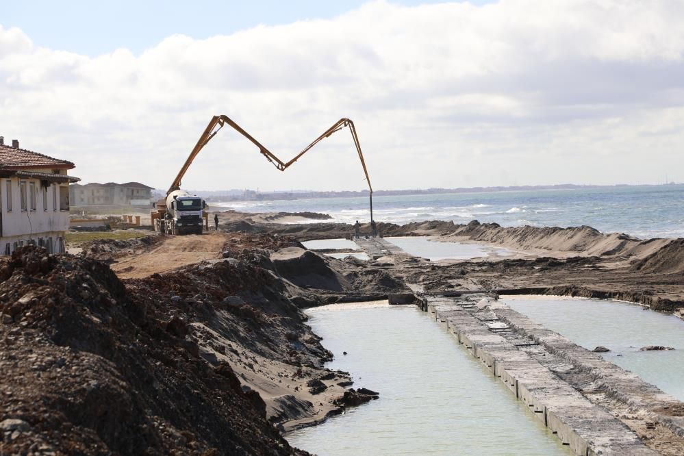 Çalışmanın teknik detayları hakkında bilgi veren Kır, projenin bölgedeki yerleşim yerlerini güvence altına alacağını belirterek, "Çalışma yer altına 2,5 metre inecek ve yer üstünde 2,5 metre yükselecek. Toplamda 5 metre olacak. Duvarın önü ve arkası taş dolgu ve kum ile doldurularak plaj haline getirilecek. Belli yerlerden vatandaş için giriş çıkış merdiveni verilecek. İki tatil köyünü koruyacak olan toplam 840 metre uzunluğundaki proje bittiğinde bir daha sahillerimizde erozyon olmayacak. Bu proje sayesinde yıkılma tehlikesi ile karşı karşıya kalan iki site kurtulacak" diye konuştu.
