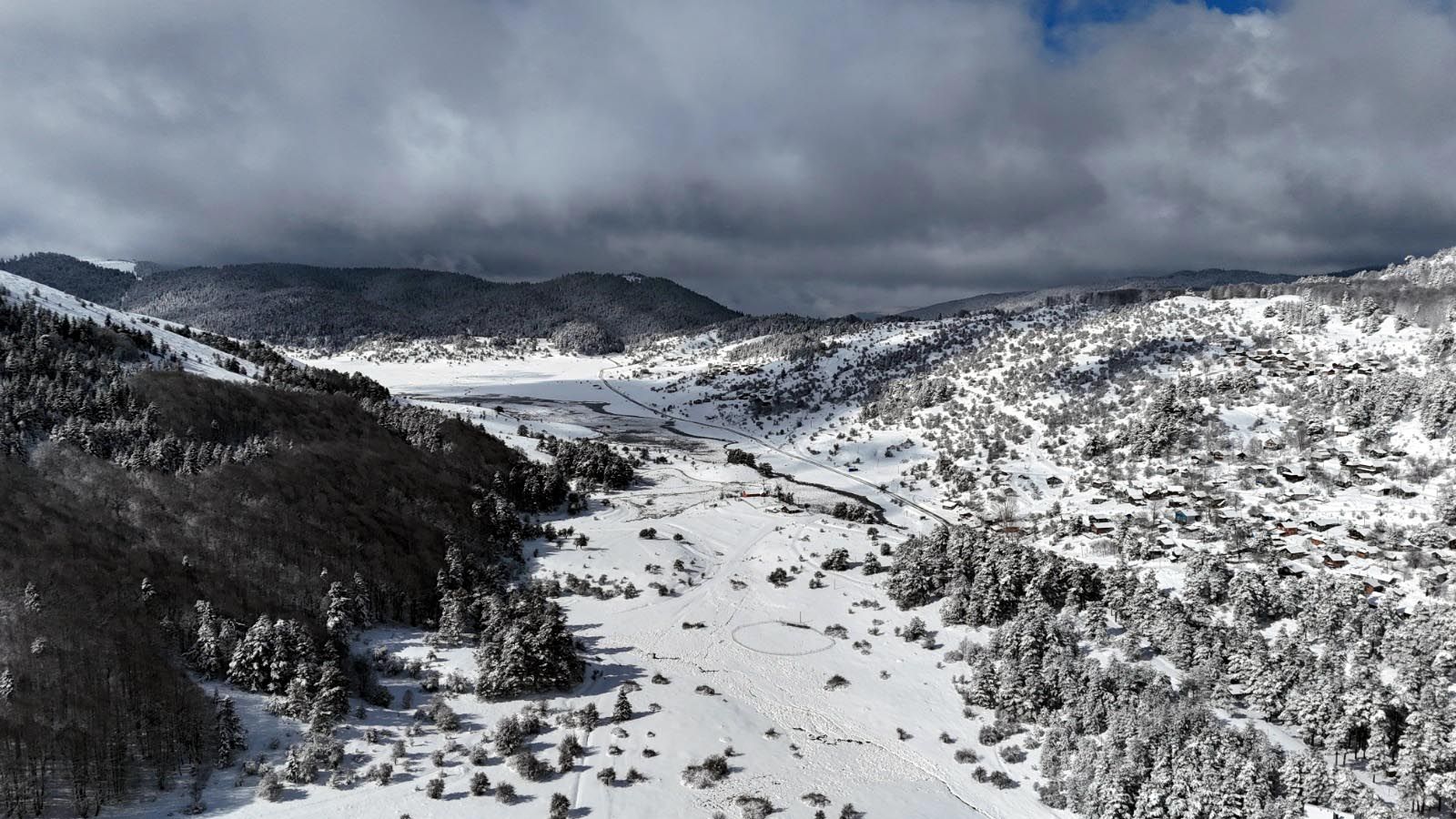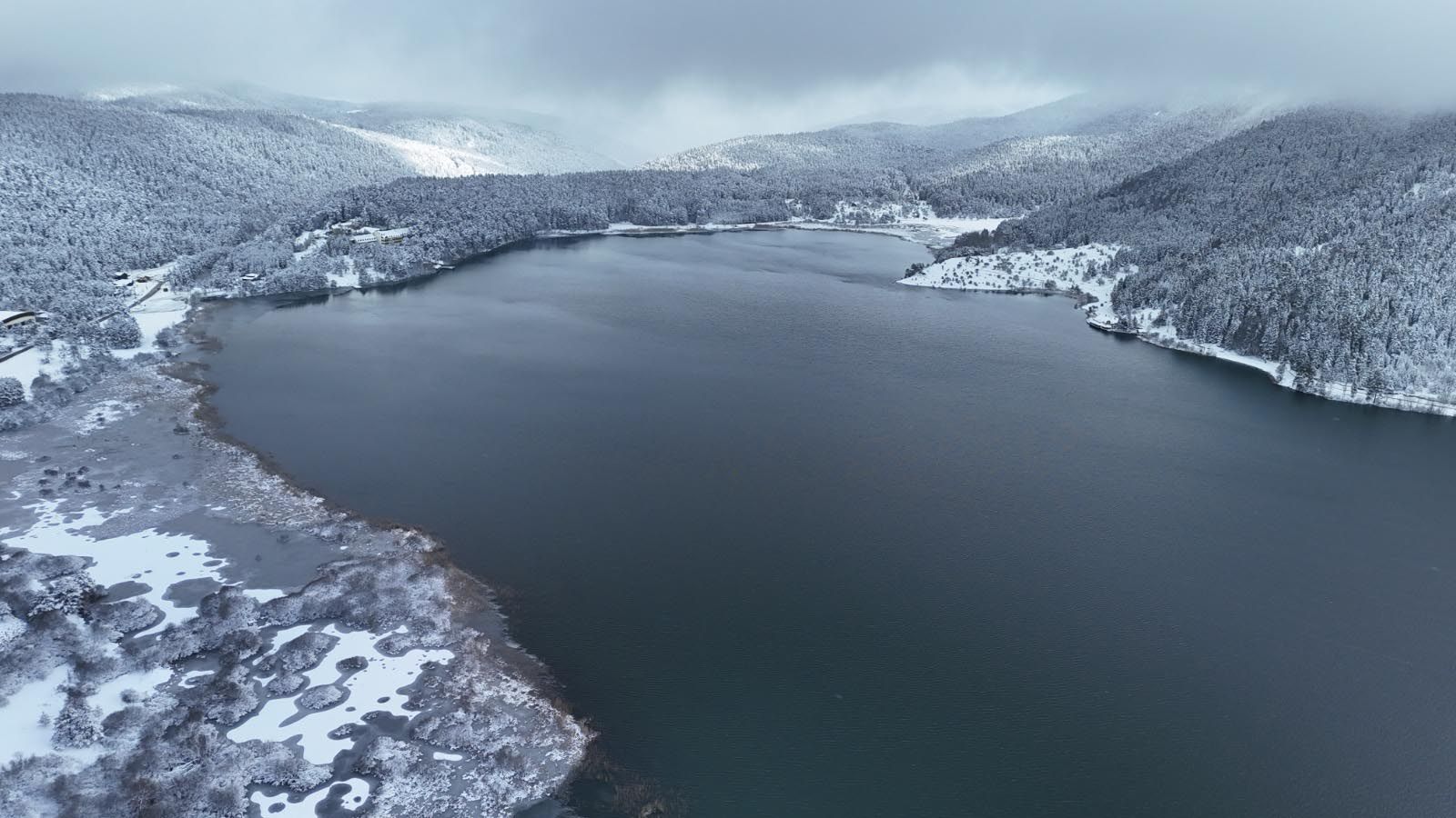 BOLU'da kar yağışının ardından Abant Gölü Milli Parkı beyaz örtüyle kaplanırken, ortaya çıkan manzara dron ile görüntülendi.