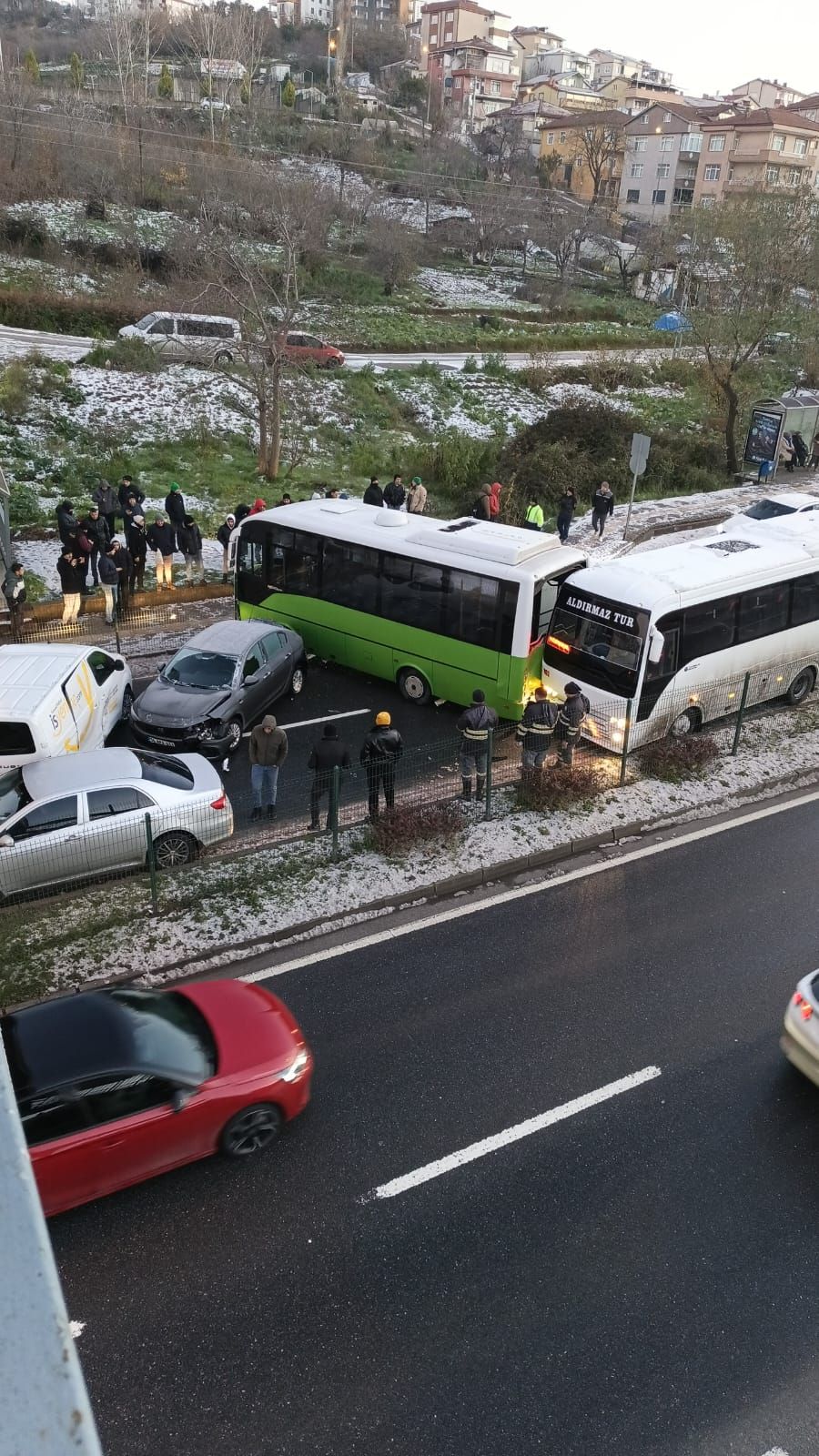 Kaza, sabah saatlerinde Ereğli ilçesi Yeşiltepe Mahallesi Devrek Yolu Caddesi'nde meydana geldi. Yoldaki buzlanma nedeniyle halk otobüsü, işçi servisi, hafif ticari araç ve 2 otomobil, kayarak birbirine çarptı. Kazada araçlarda hasar oluştu. Kaza nedeniyle yol trafiğe kapandı. İhbarla bölgeye gelen polis ekiplerinin müdahalesi ile araçlar yoldan kaldırıldı. Araç sürücüleri, hazırlanan kaza tutanağının ardından olay yerinden ayrıldı. Yolda ulaşım normale döndü.