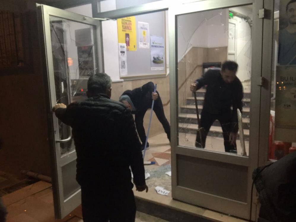 Biz vatan haini miyiz?" diye bağırdıktan sonra kaldırım yapımında kullanılan taşları alarak kurumun camlarını parçaladı. Binanın iki kapısının da camlarını taşla parçalayan şüpheli, daha sonra kapıları ve binanın önünde bulunan araçları tekmeledi. Kurumun camlarını parçalayan şüpheli, daha sonra olay yerinden ayrıldı.