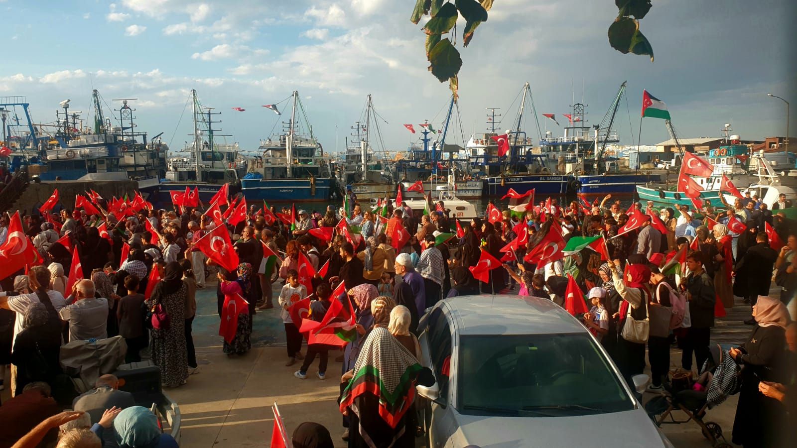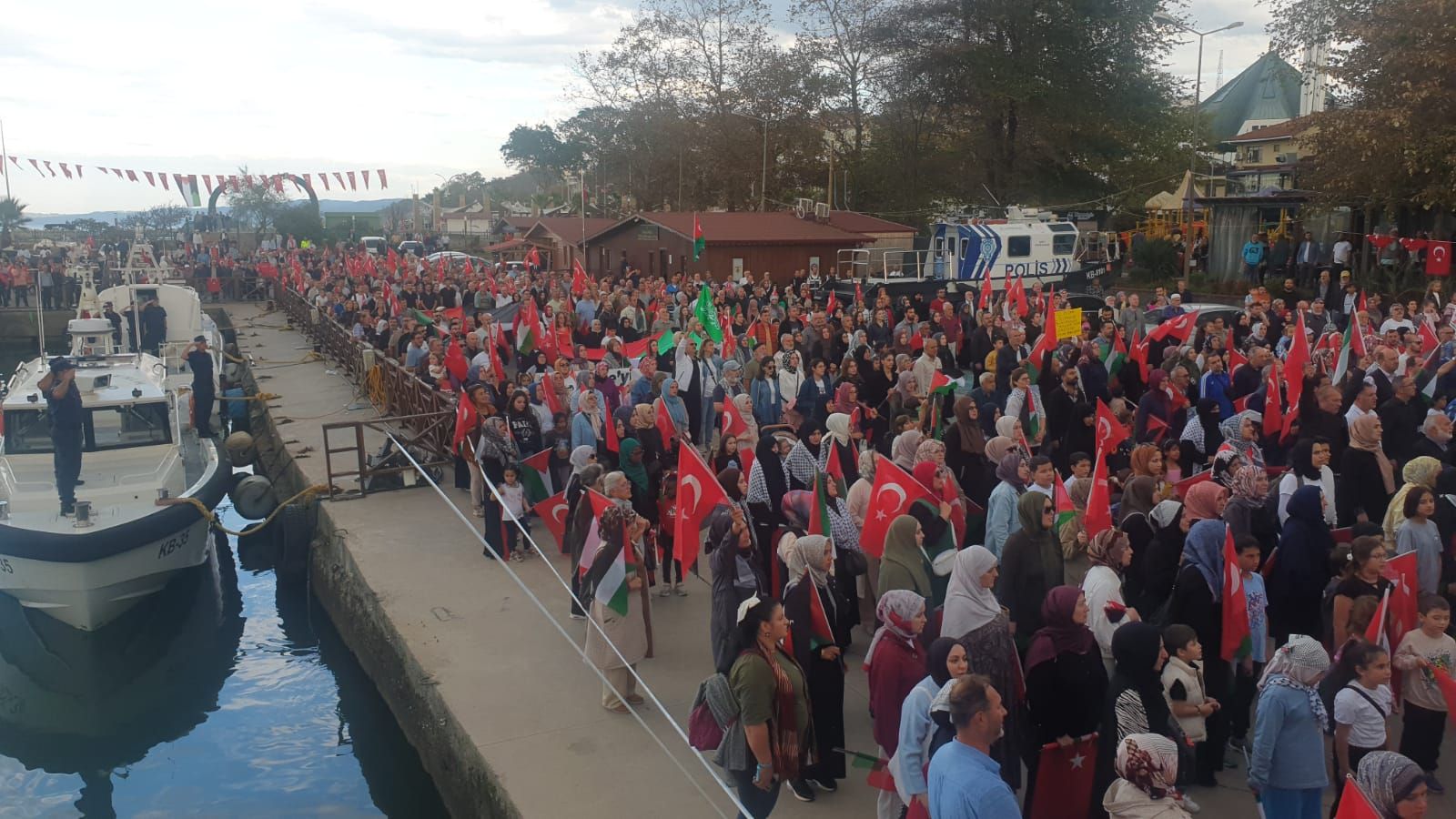 DÜZCE’nin Akçakoca ilçesinde vatandaşlar, Gazze’ye insani yardım ulaştırmak için yola çıkan ve İsrail’in saldırısına uğrayan küresel Sumud filosuna destek için Akçakoca Limanı’nda toplandı.