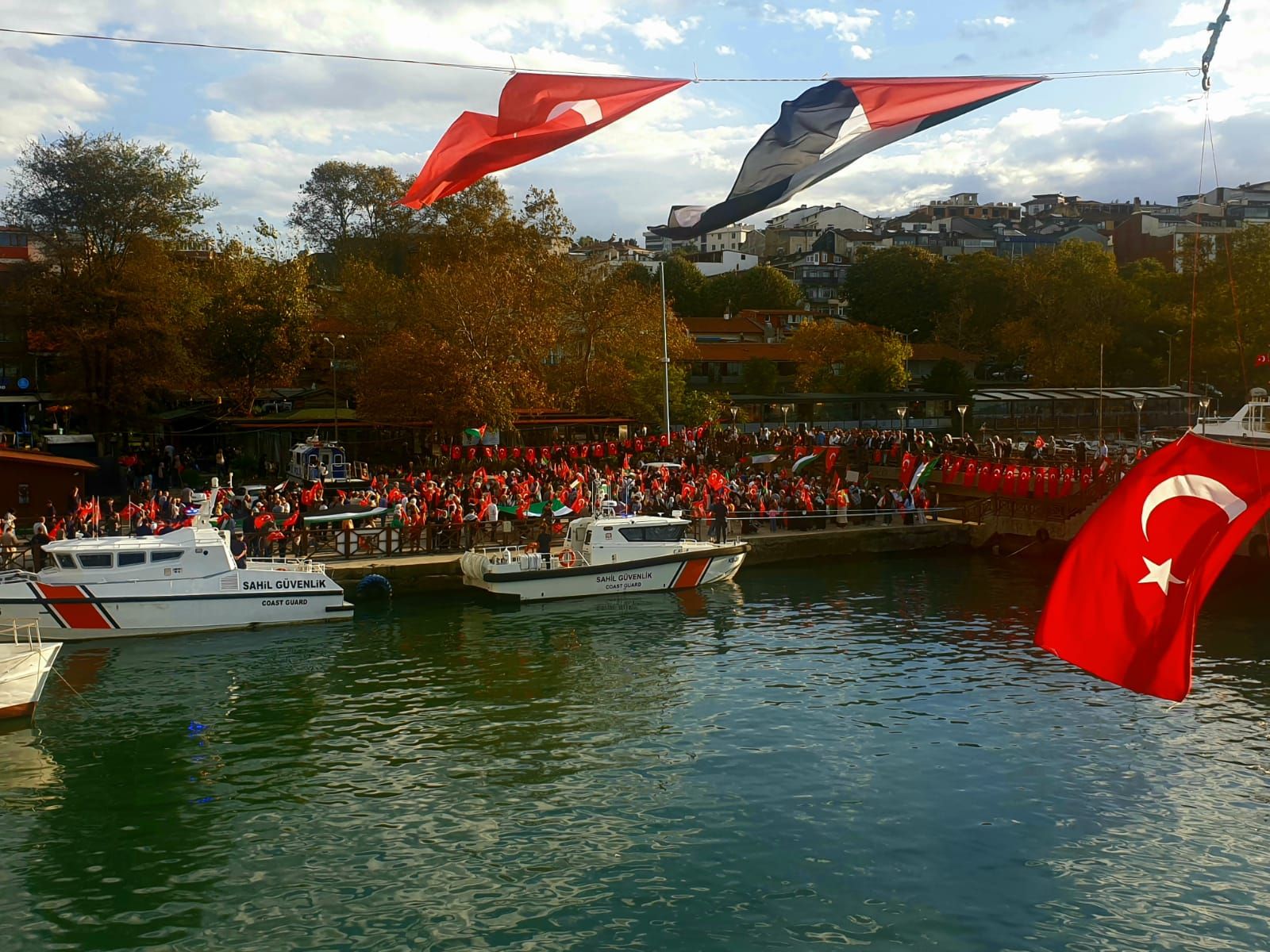 Akçakoca’da akşam saatlerinde Filistin’e Destek Platformu öncülüğünde düzenlenen programa sivil toplum kuruluşları, siyasi parti temsilcileri ve vatandaşlar katıldı. Limanda da balıkçılar teknelerinin sirenlerini çalarak, ellerinde Türk ve Filistin bayraklarıyla alanı dolduran kalabalığa destek verdi. AK Parti Düzce milletvekilleri Ayşe Keşir ve Ercan Öztürk, Akçakoca Belediye Başkanı Fikret Albayrak ve AK Parti Düzce İl Başkanı Hasan Şengüloğlu da programda yer aldı. Program, Gazze ve Sumud filosu için edilen dua ile sona erdi.