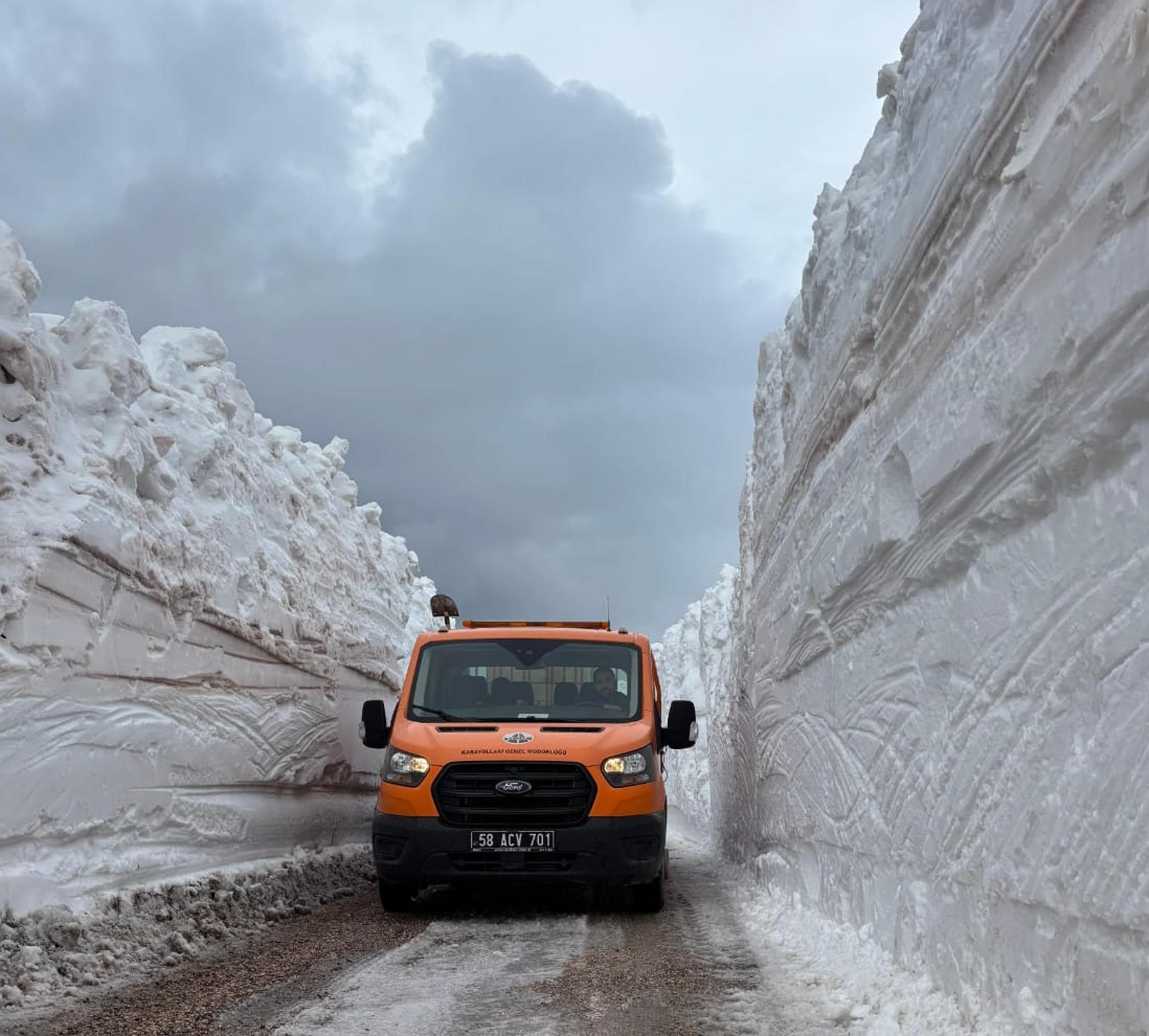 Yoğun kar yağışı ve tipi nedeniyle bir süredir ulaşıma kapalı olan ve kar kalınlığının yer yer 4 metrenin üzerine çıktığı kara yolunda ekipler, iş makineleriyle yolu açmak için çalışıyor. Kar kalınlığının iş makinesinin boyunu aştığı bölgede iş makineleri kar kütlelerini güçlükle temizliyor. Karayolları ekipleri, ulaşımın yeniden başlaması için kar temizliğini sürdürüyor.
