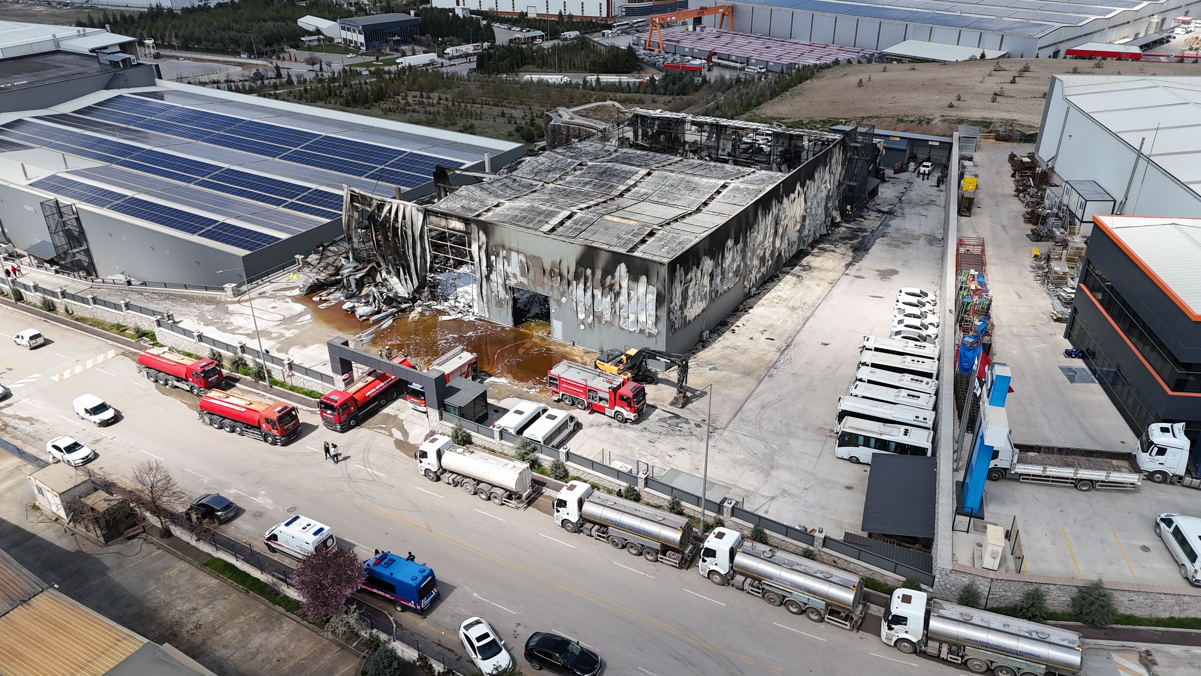 ANKARA'nın Sincan ilçesinde medikal malzeme üretilen fabrikadaki yangında soğutma çalışmaları tamamlandı. Kullanılamaz hale gelen fabrikadaki hasar dron ile havadan görüntülendi.