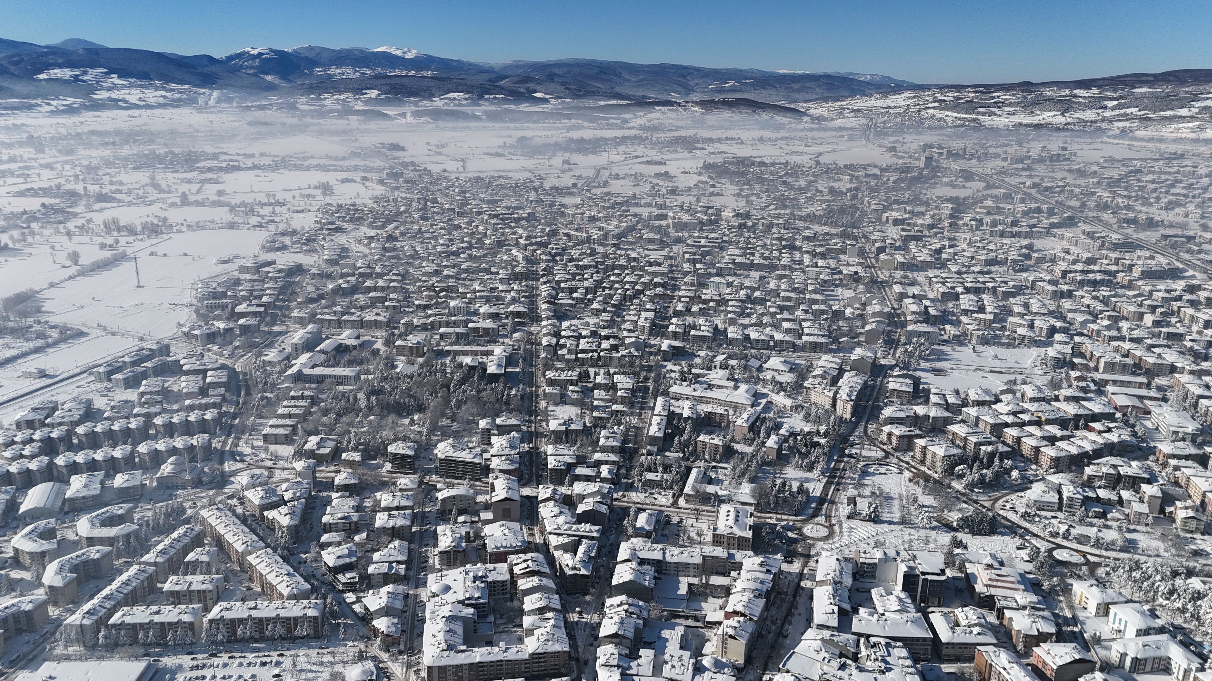Bolu'da 6 gün boyunca kar yağışı etkili oldu. Yeşil alanlarda kar kalınlığı merkezde 1 metreye, yüksek kesimlerde 2,5 metreye yaklaştı. Dün akşam saatlerinde etkisini yitiren kar yağışı, yerini soğuğa bıraktı. Hava sıcaklığı, gece saatlerinde Bolu'nun Dörtdivan ilçesinde sıfırın altında 23,8 santigrat derece olarak ölçüldü. Merkezdeki en düşük sıcaklık ise gece saatlerinde sıfırın altında 18 derece olarak ölçüldü. Karayolları ve belediye ekipleri, kar küremenin ardından buzlanma riskine karşı tuzlama çalışması yapıyor. Karla kaplanan kent, dronla görüntülendi.