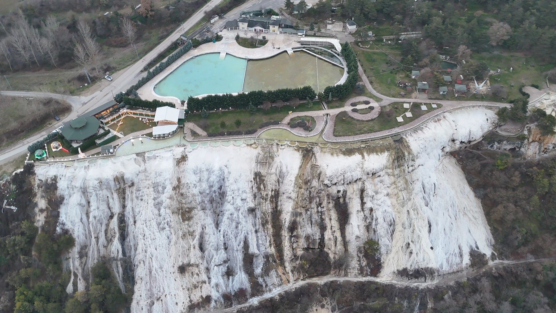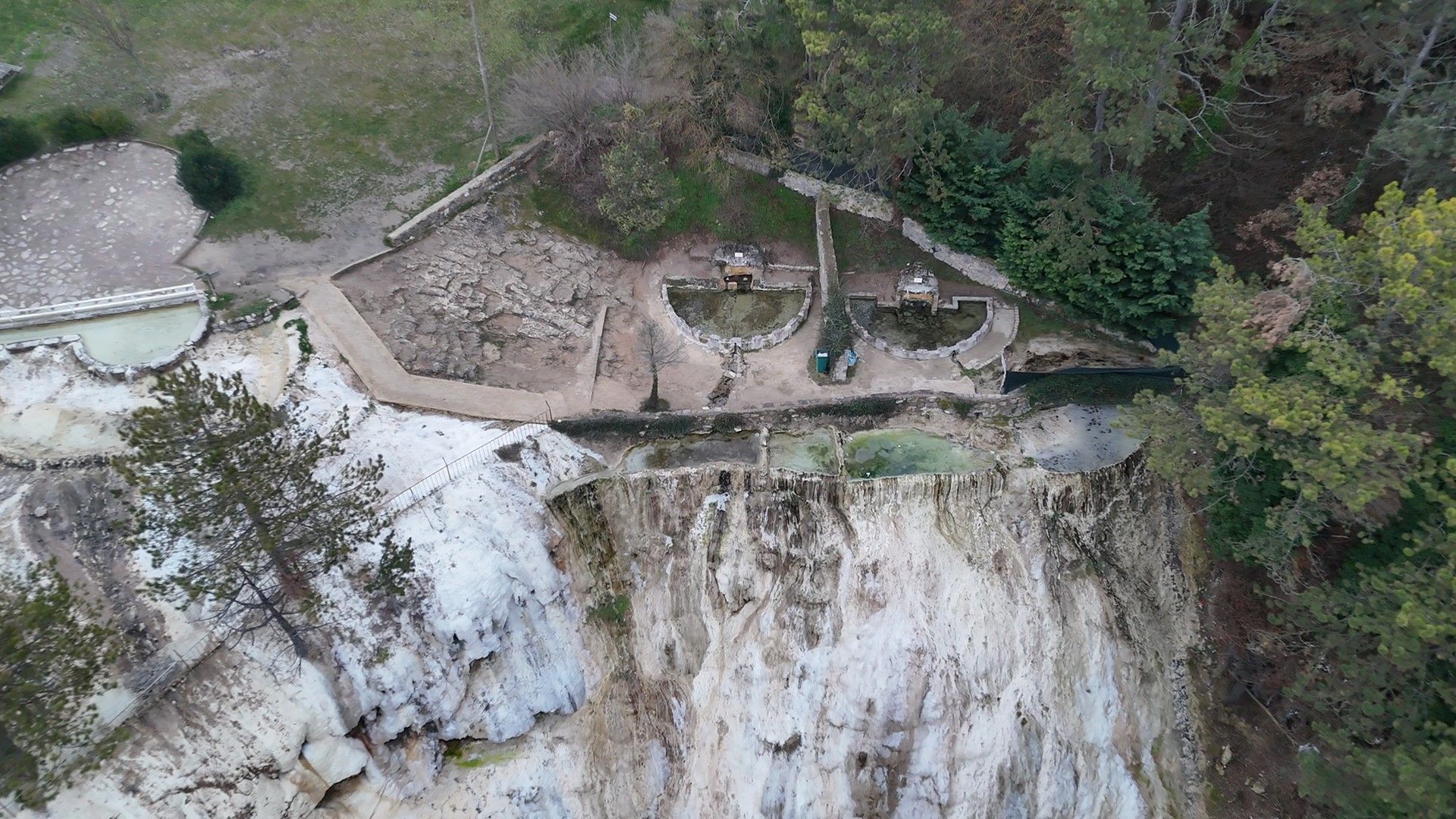 Yeşil çam ormanlarının arasındaki beyaz dokusuyla güzel manzaralar oluşturan travertenler, dron ile havadan görüntülendi.