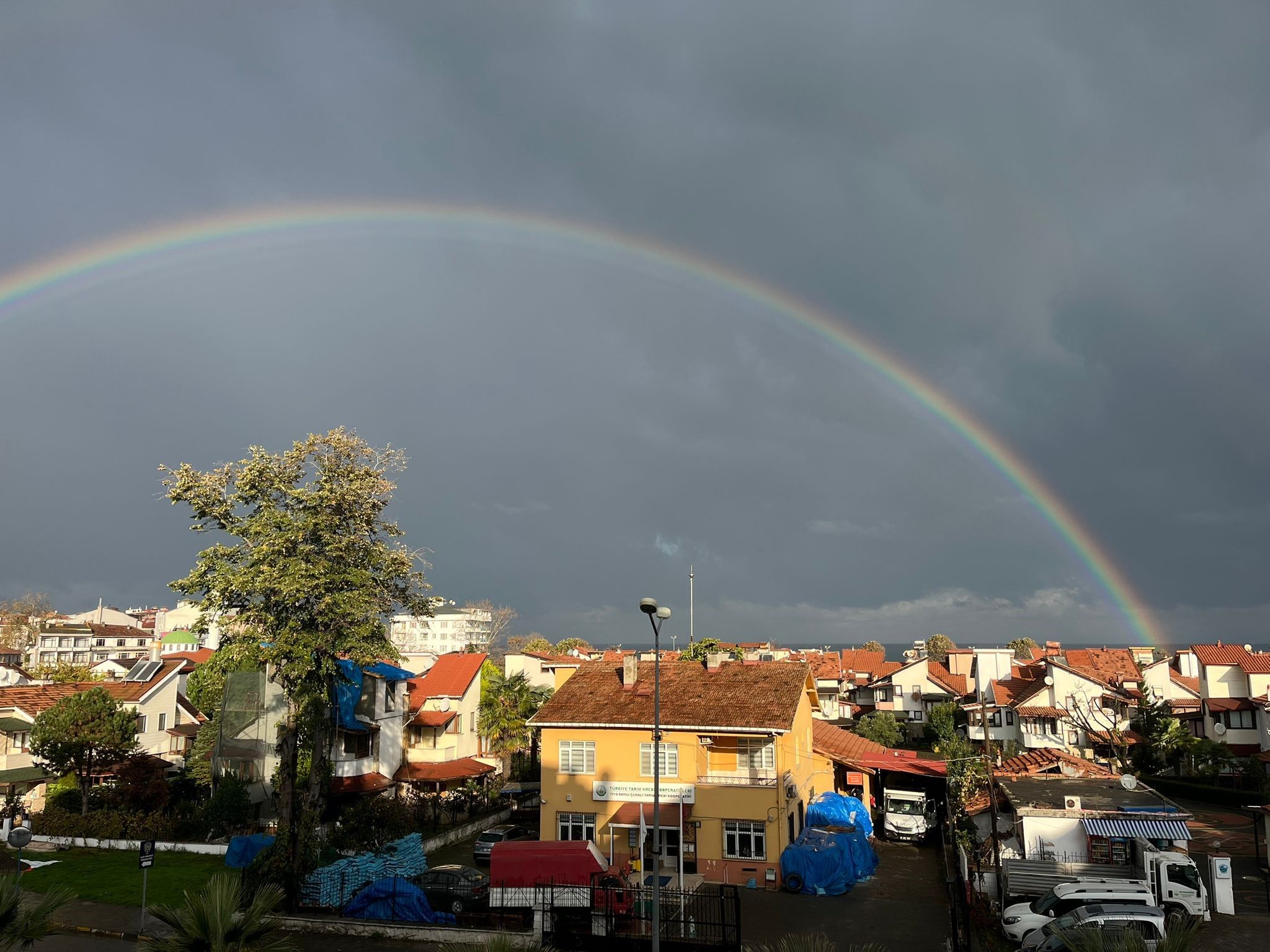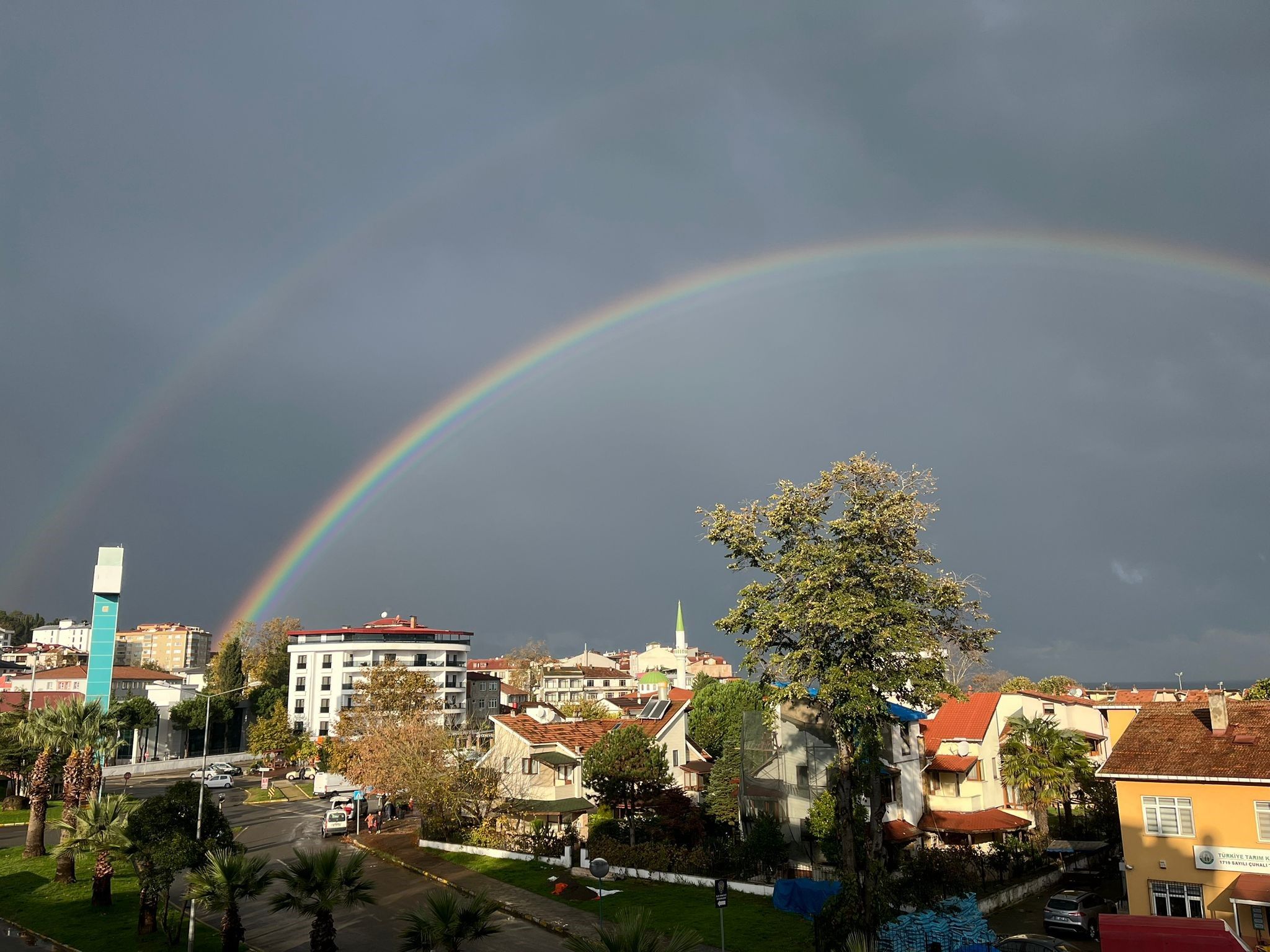 Düzce’nin Akçakoca ilçesinde yağmur sonrası beliren ve görsel şölen oluşturan gökkuşağı kameraya yansıdı.