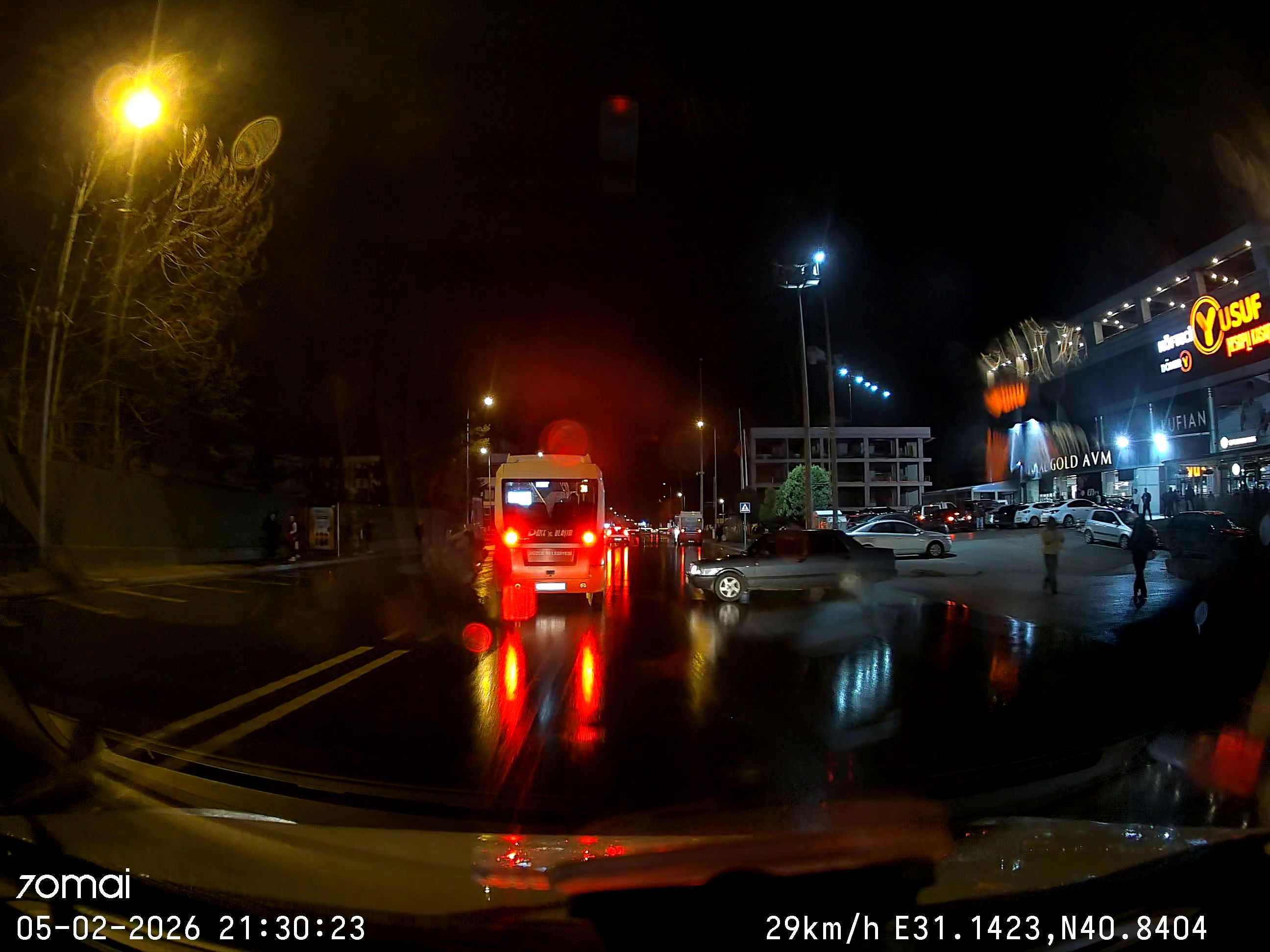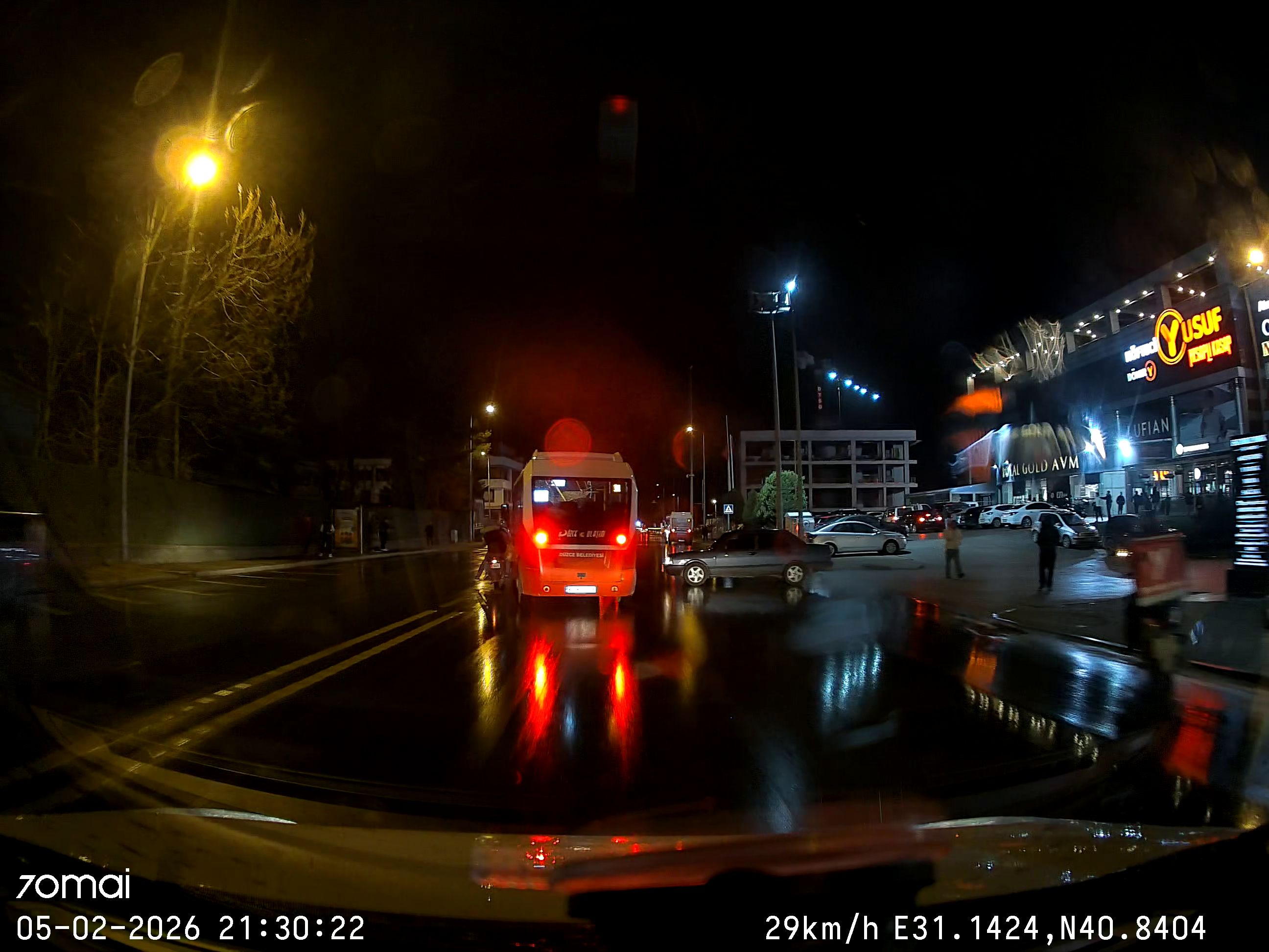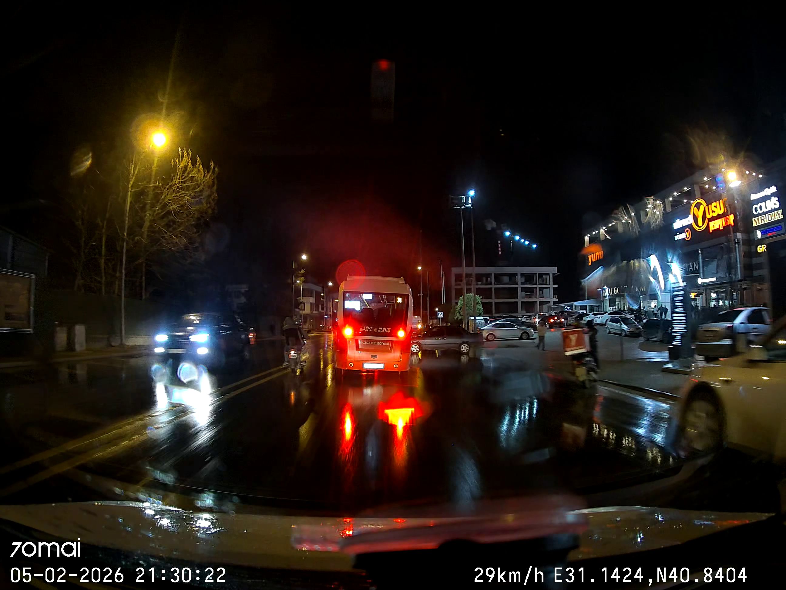 DÜZCE’de, caddeye çıkmaya çalışan otomobile çarpmamak için sürücüsünün ani manevra yaptığı özel halk otobüsü, motosikletle çarpıştı. Araç içi kamerasına yansıyan kazada 1 kişi yaralandı.