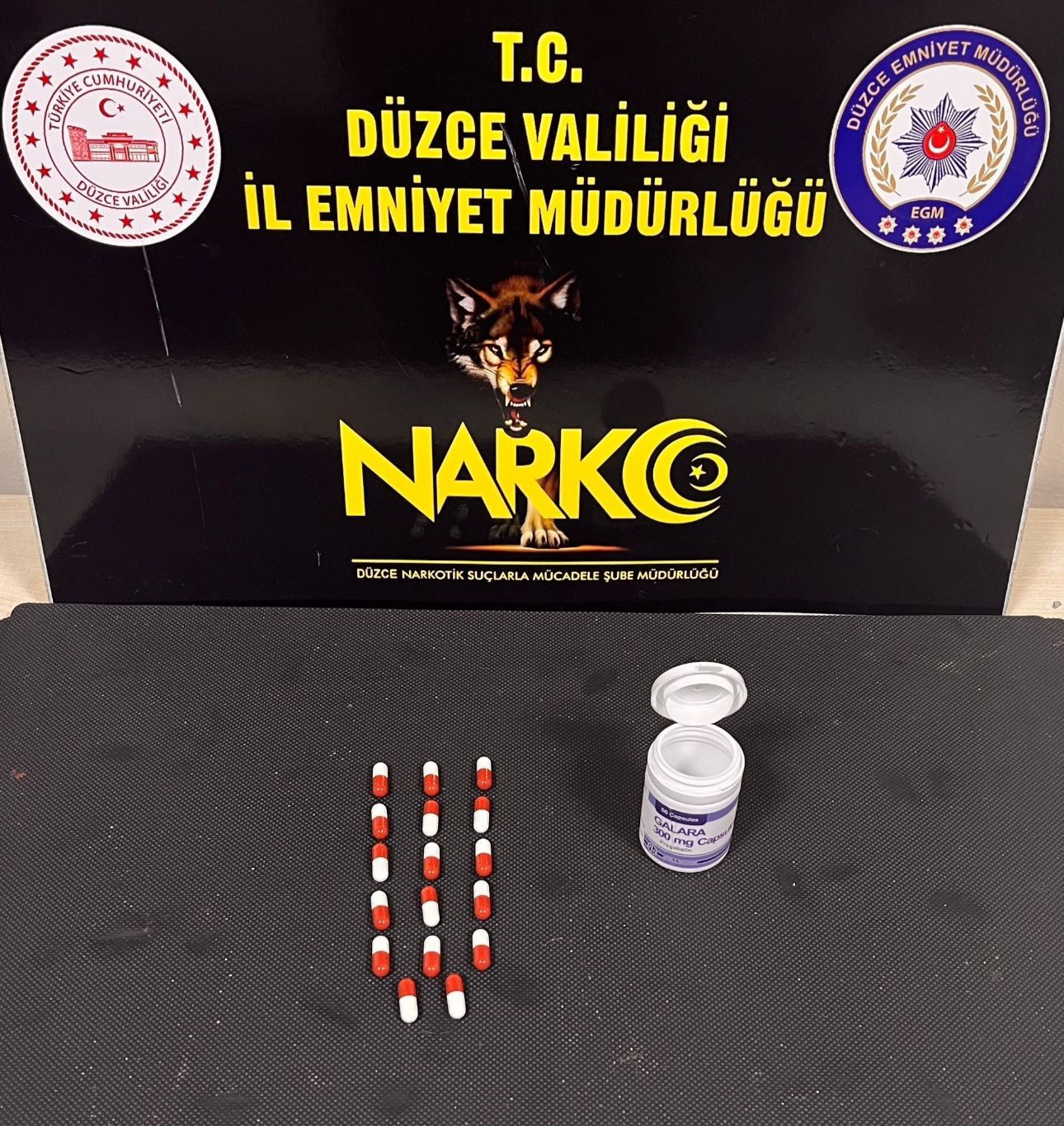 Düzce'de polis ekipleri tarafından yapılan çalışmada daha önceden 4 suç kaydı bulunan şüpheli şahıs 17 sentetik uyuşturucu hap ile yakalandı. H.A. çıkarıldığı mahkemece tutuklandı.
