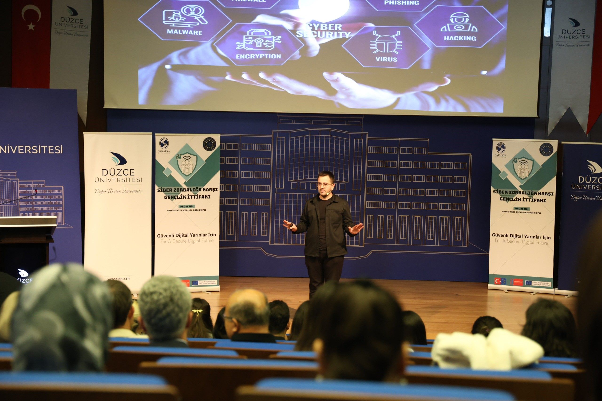 Düzce Üniversitesi Araştırma Dekanlığı ile Sakarya Üniversitesi iş birliğinde, dijital dünyada çevrim içi güvenlik farkındalığını artırmak ve siber zorbalıkla mücadele bilincini geliştirmek amacıyla düzenlenen, "Siber Zorbalıkla Mücadelede Sen De Varsın" başlıklı proje eğitimi gerçekleştirildi.
