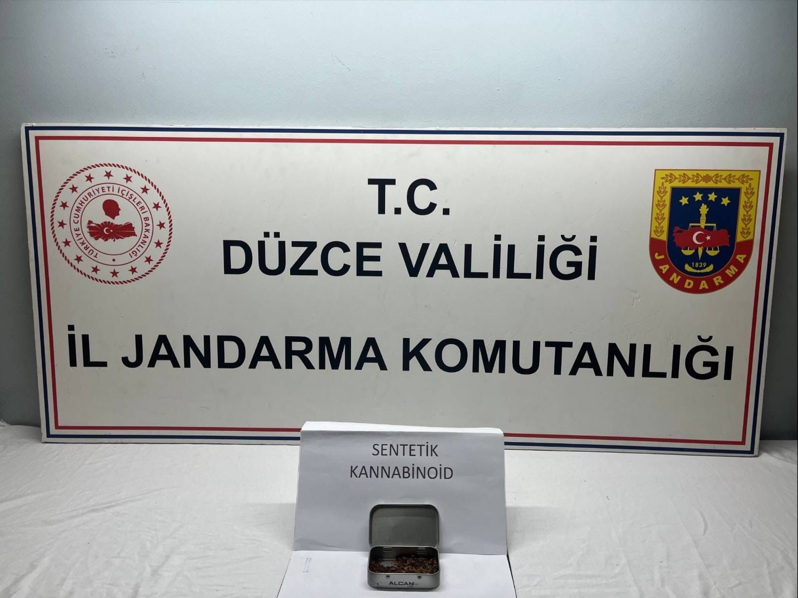 Düzce Cumhuriyet Başsavcılığı koordinesinde yapılan çalışmalarda Düzce İl Jandarma Komutanlığı ekiplerinin Ballıca Köyü'nde yaptıkları devriye faaliyetleri sırasında durumundan şüphelenilen N.İ isimli şahıs durduruldu. Şahsın üzerinde yapılan aramada aseton kutu içerisinde yaklaşık 3 mililitre sıvı sentetik kannabinoid, toplam 322 gram sentetik kannabinnoid olduğu değerlendirilen madde, 3 adet payp, 2 gram Metamfetamin, 1 adet makaron içerisine sıkıştırılmış içime hazır uyuşturucu veya uyarıcı olduğu değerlendirilen madde tespit ele geçirildi.