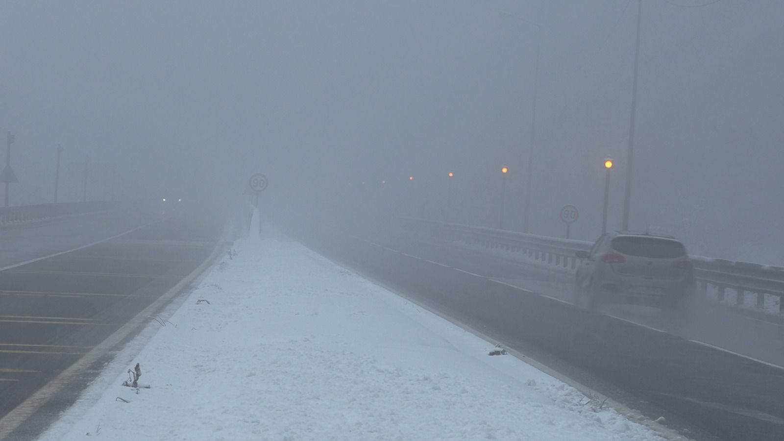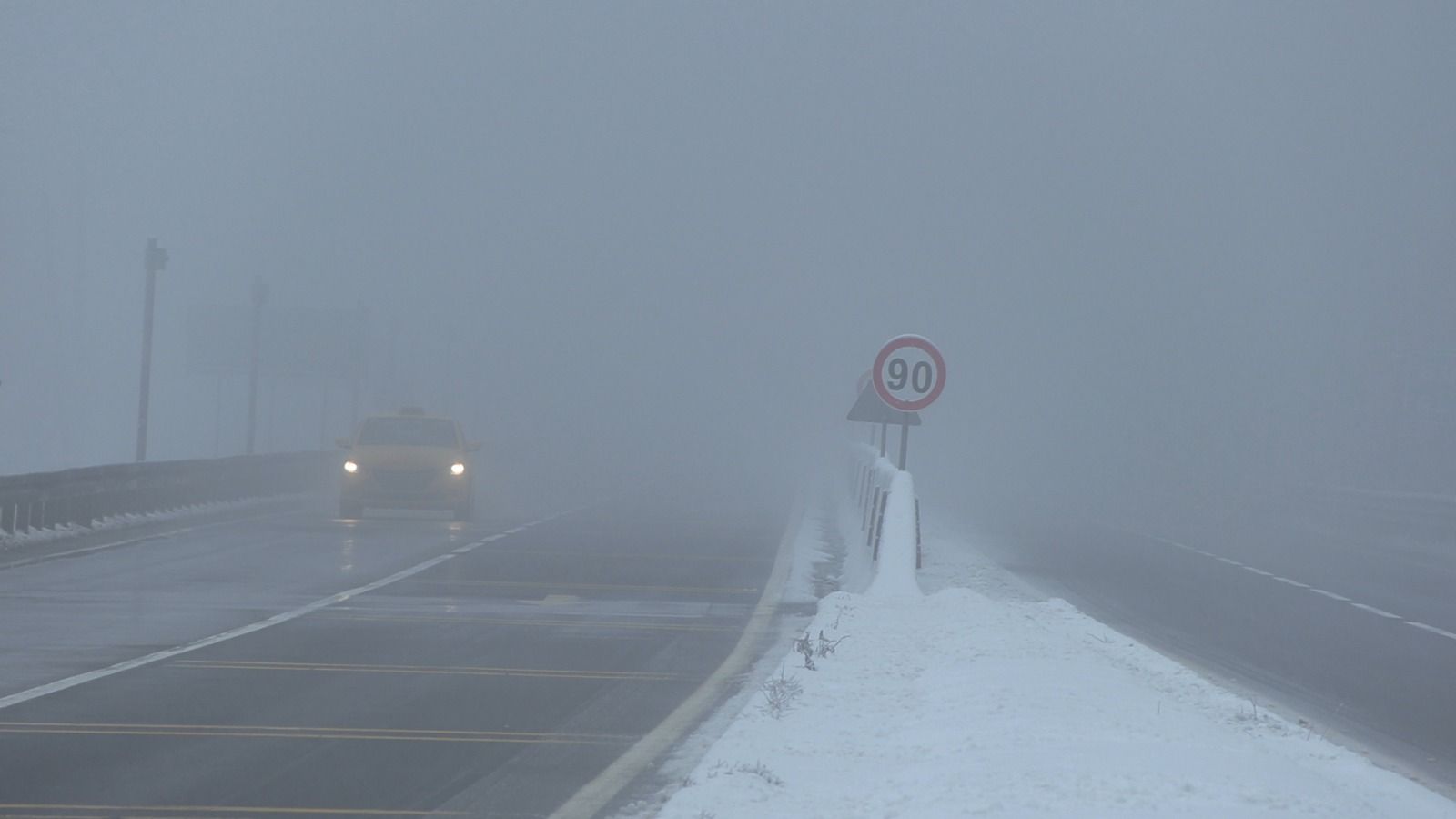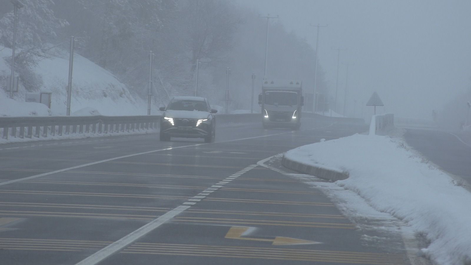 Bolu Dağı'nın D-100 kara yolu geçişinde gece kar yağışı aralıklarla etkili olurken, sabah saatlerinde durdu. Bolu Dağı'nın Karanlıkdere ve Seymenler mevkilerinde etkili olan sis nedeniyle görüş mesafesi, yaklaşık 30 metreye düştü.