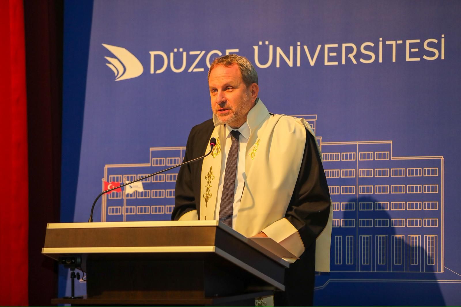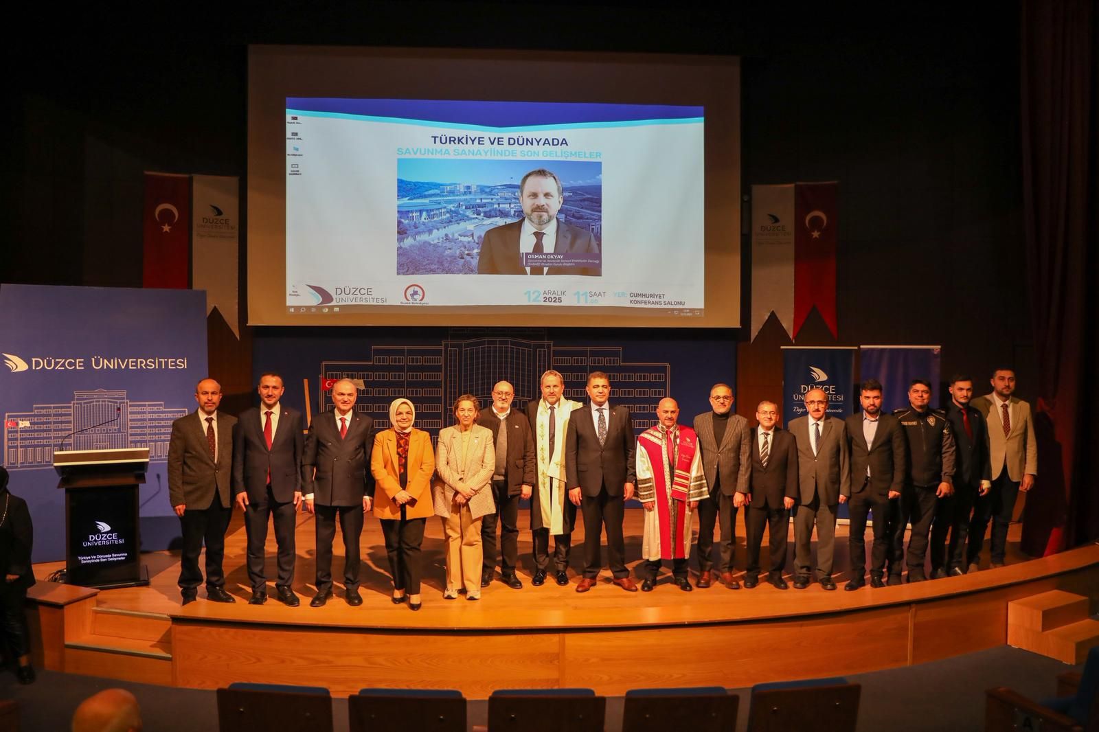 Düzce Belediye Başkanı Dr. Faruk Özlü’nün daveti ile Düzce’ye gelen Savunma Sanayicileri Derneği Başkanı ve Kale Grubu Yönetim Kurulu Başkan Vekili Osman Okyay Düzce Üniversitesi’nde düzenlenen fahri doktora töreninde “Dünyada ve Türkiye’de Savunma Sanayinde Son Gelişmeler” başlıklı konferansta tecrübelerin paylaştı. Öğrenci ve akademisyenlere seslenen Okyay, üniversite ve sanayi işbirliğinin, laboratuardan sahaya uzanan bilgi akışının büyük bir önem taşıdığını vurguladı.