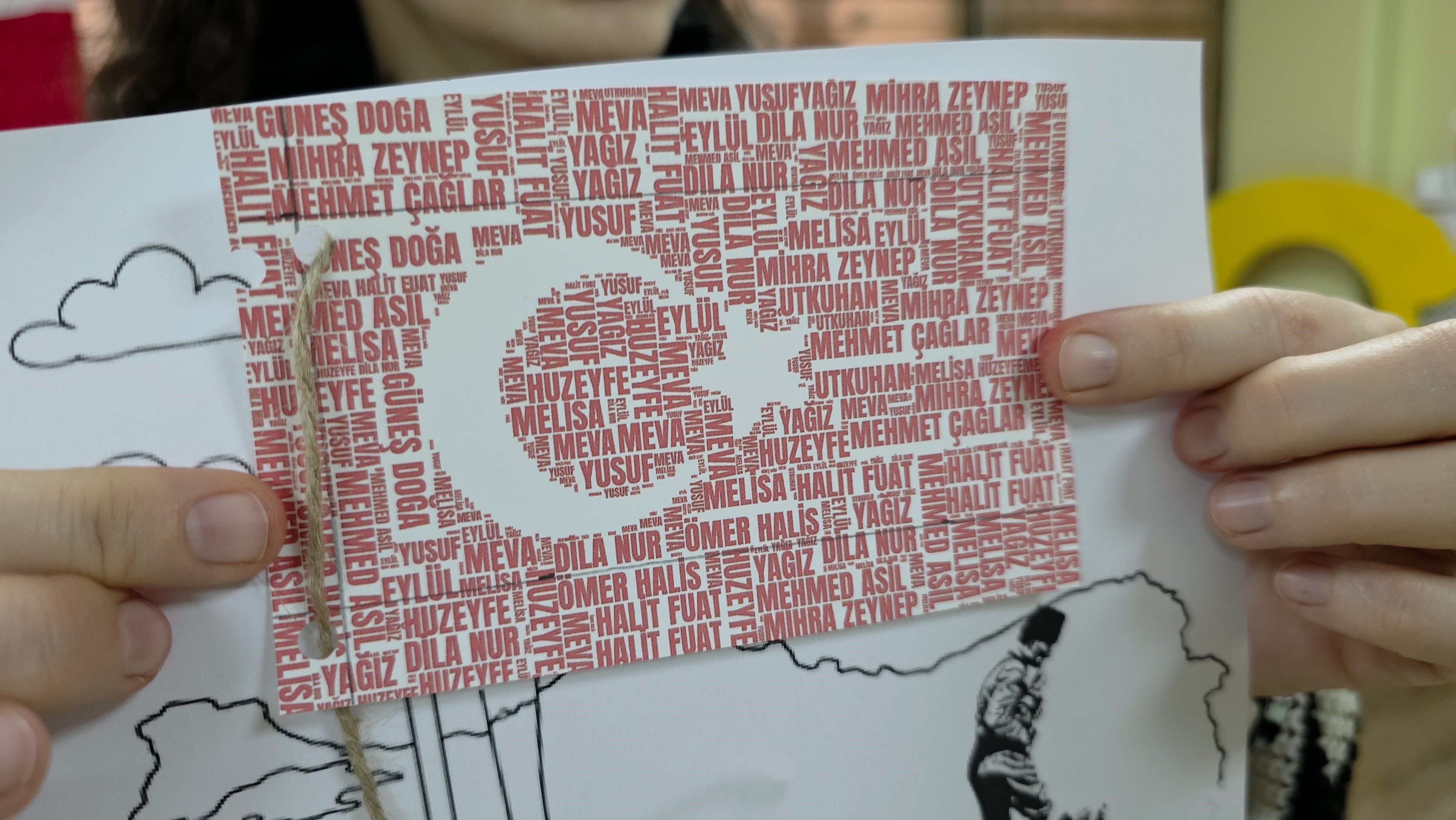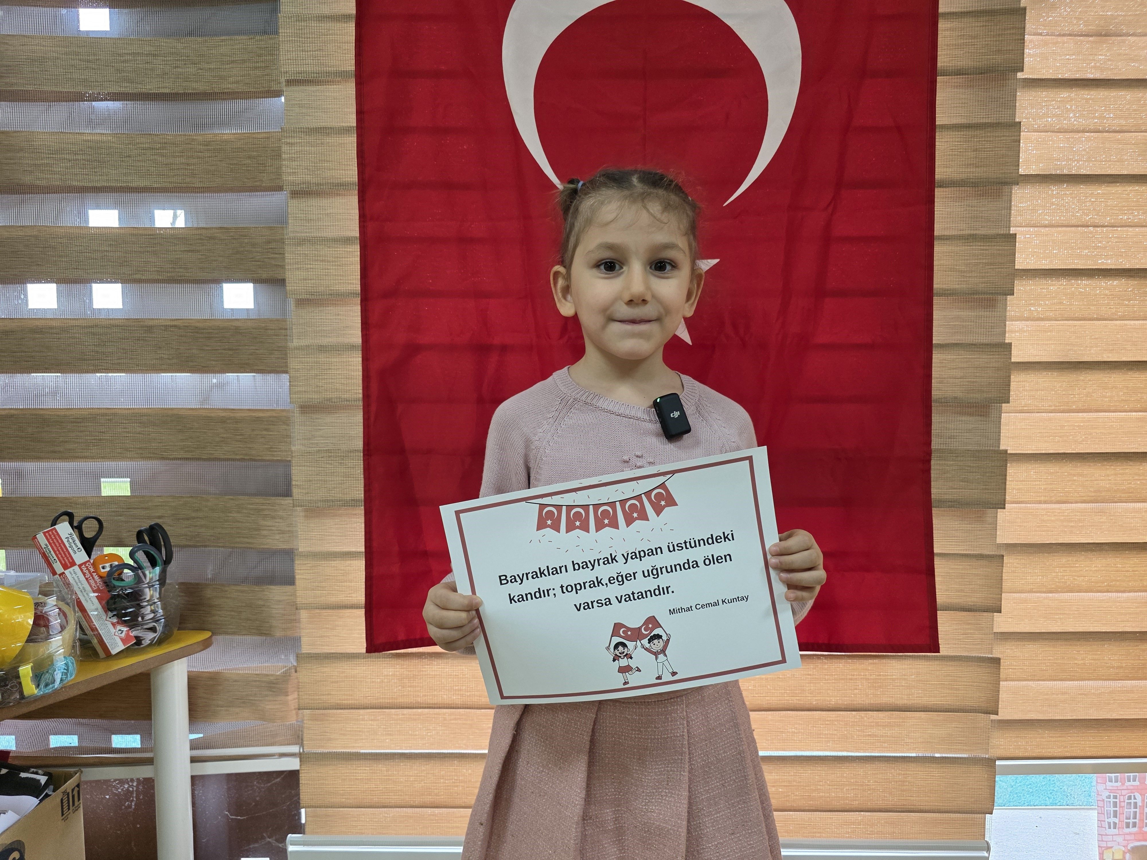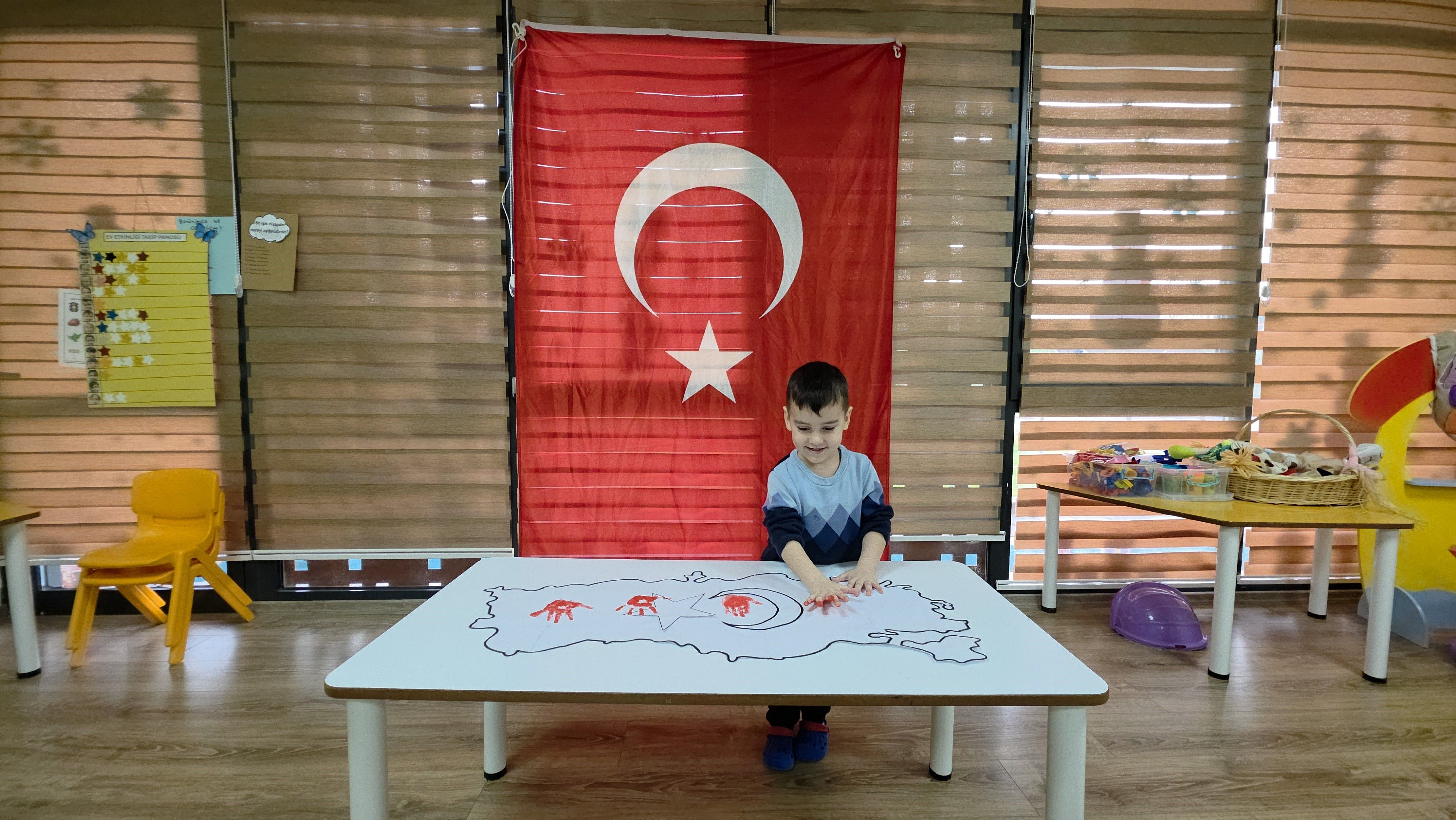 3-4 yaş sınıfında ise minik öğrenciler Türkiye haritası üzerinde el baskısı yaparak Türk bayrağını oluşturdular. Minikler, bayrağı oluşturduktan sonra coşkuyla Türk bayrağı sallayarak etkinliklerini tamamladılar.