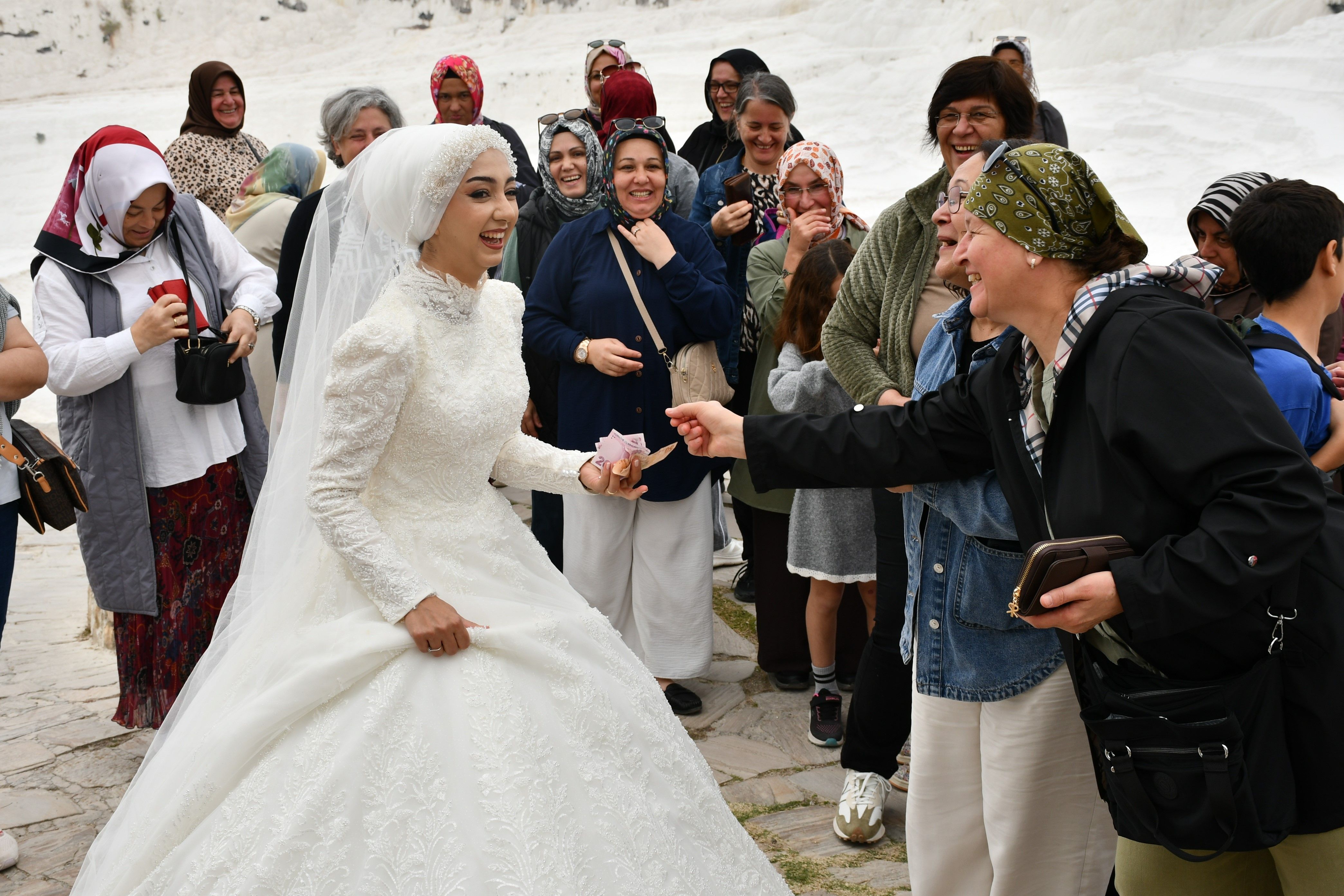 Denizli'de geçen yıl evlenen çift, düğün fotoğraflarını beğenmeyince Pamukkale travertenlerinde yeniden düğün çekimi planladı. Travertenlerde fotoğraf çekimi yaptıran çiftle sohbet eden turistlerin takı takmaları unutulmaz anlar yaşattı.