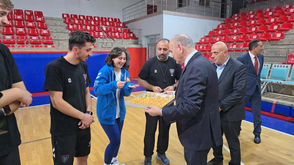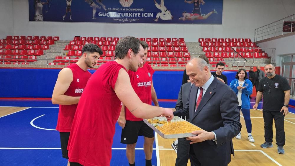 Düzce Belediye Başkanı Faruk Özlü, Türkiye Voleybol Federasyonu (TVF) Erkekler 1. Ligi’nde mücadele eden Düzce Belediyesi Spor Akademisi Voleybol Takımı’nın antrenmanına katıldı. Özlü, voleybol takımı oyuncularını Fenerbahçe SK galibiyetinden dolayı tebrik ederek baklava ikramında da bulundu.