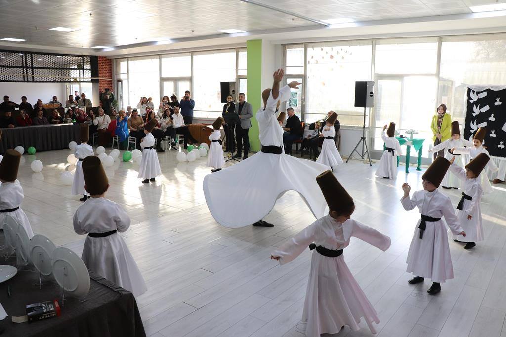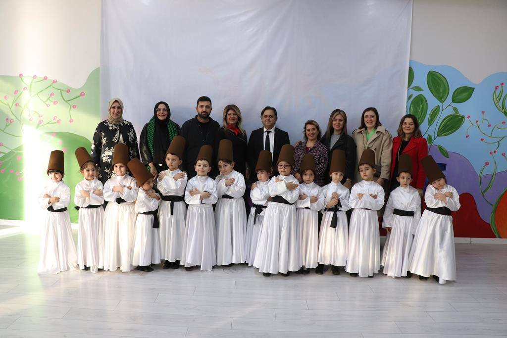 Gösterinin sonunda minik semazenler, başkan yardımcısı Burçin Sarıcan ve salonda bulunan misafirlere Mevlana şekeri ikramında bulundu.