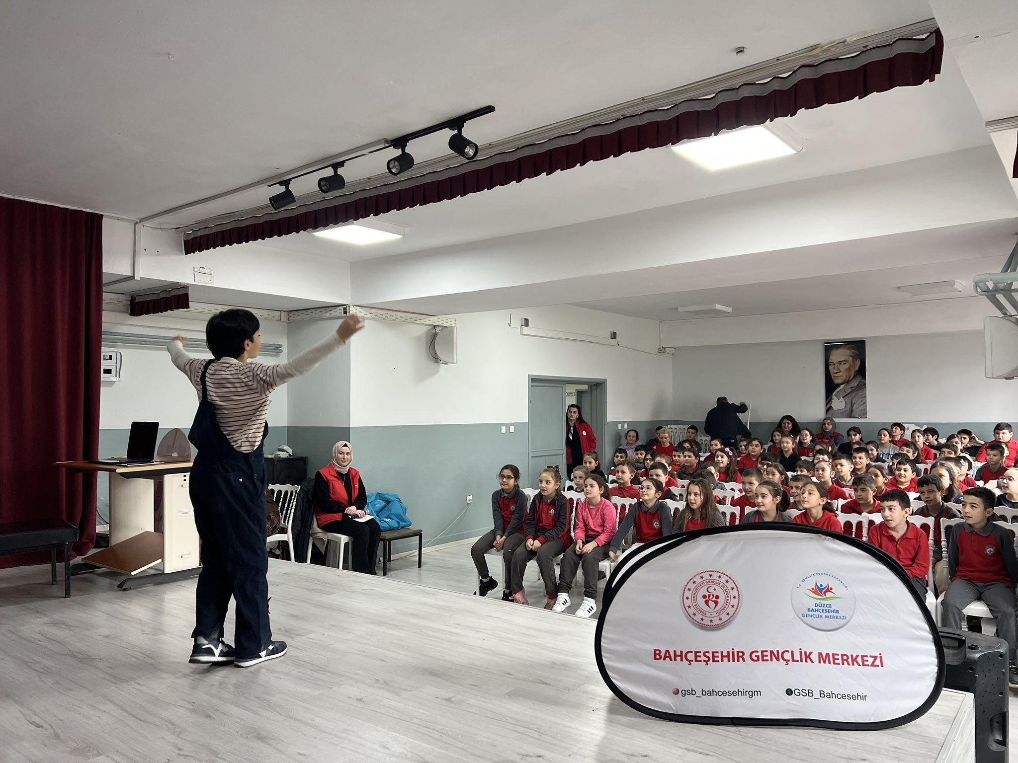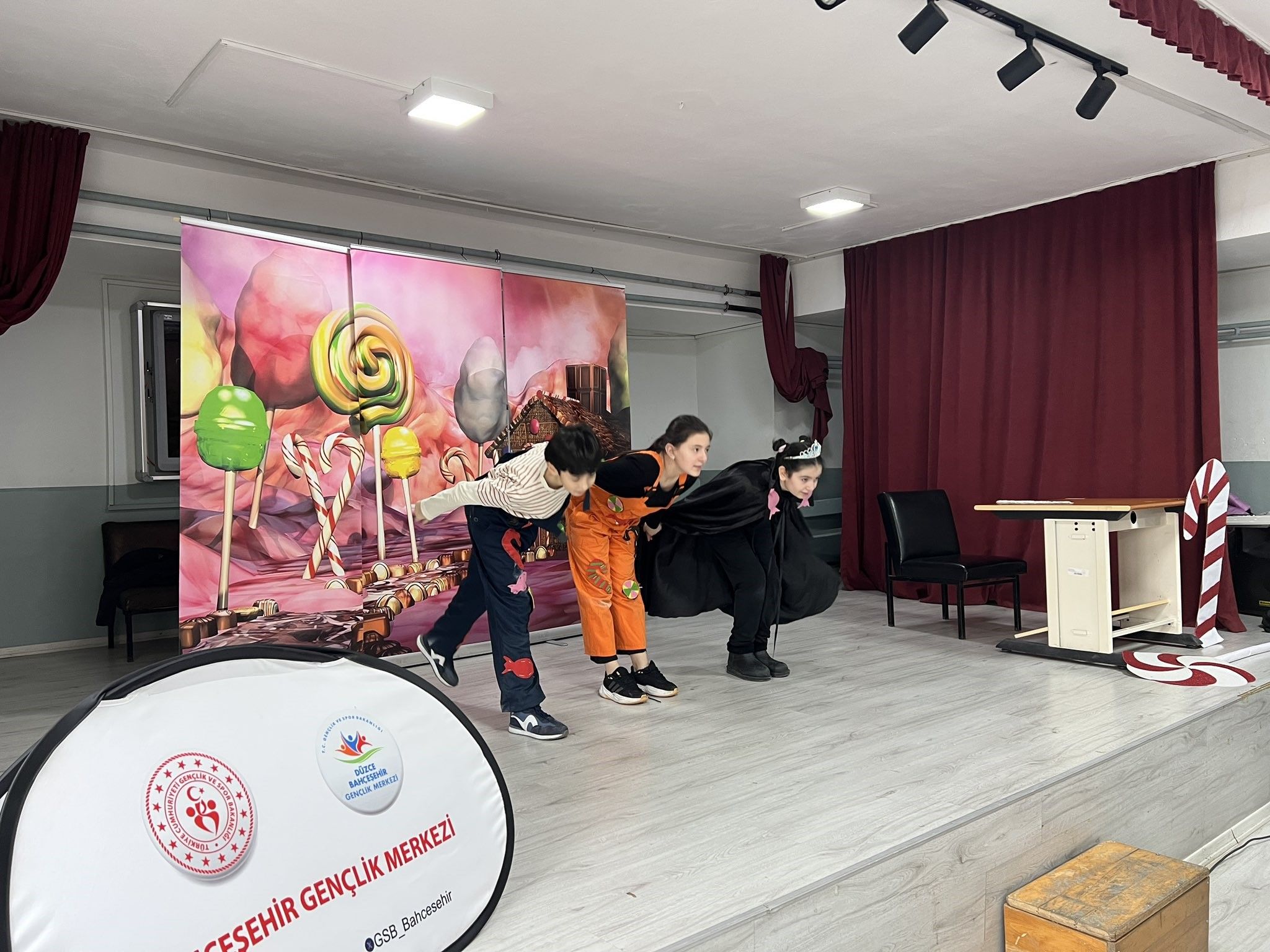 Düzce Bahçeşehir Gençlik Merkezi tiyatro kursiyerleri tarafından sahnelenen eğlenceli ve eğitici içerikli gösteri, öğrencilerden büyük beğeni topladı. Tiyatro etkinliğiyle, çocukların sosyal, kültürel ve duygusal gelişimlerine katkı sunulması, sanata olan ilgilerinin artırılması ve özgüven kazanmalarının desteklenmesi hedeflendi. Program sonunda öğrenciler, tiyatro kursiyerlerine alkışlarıyla teşekkür etti.