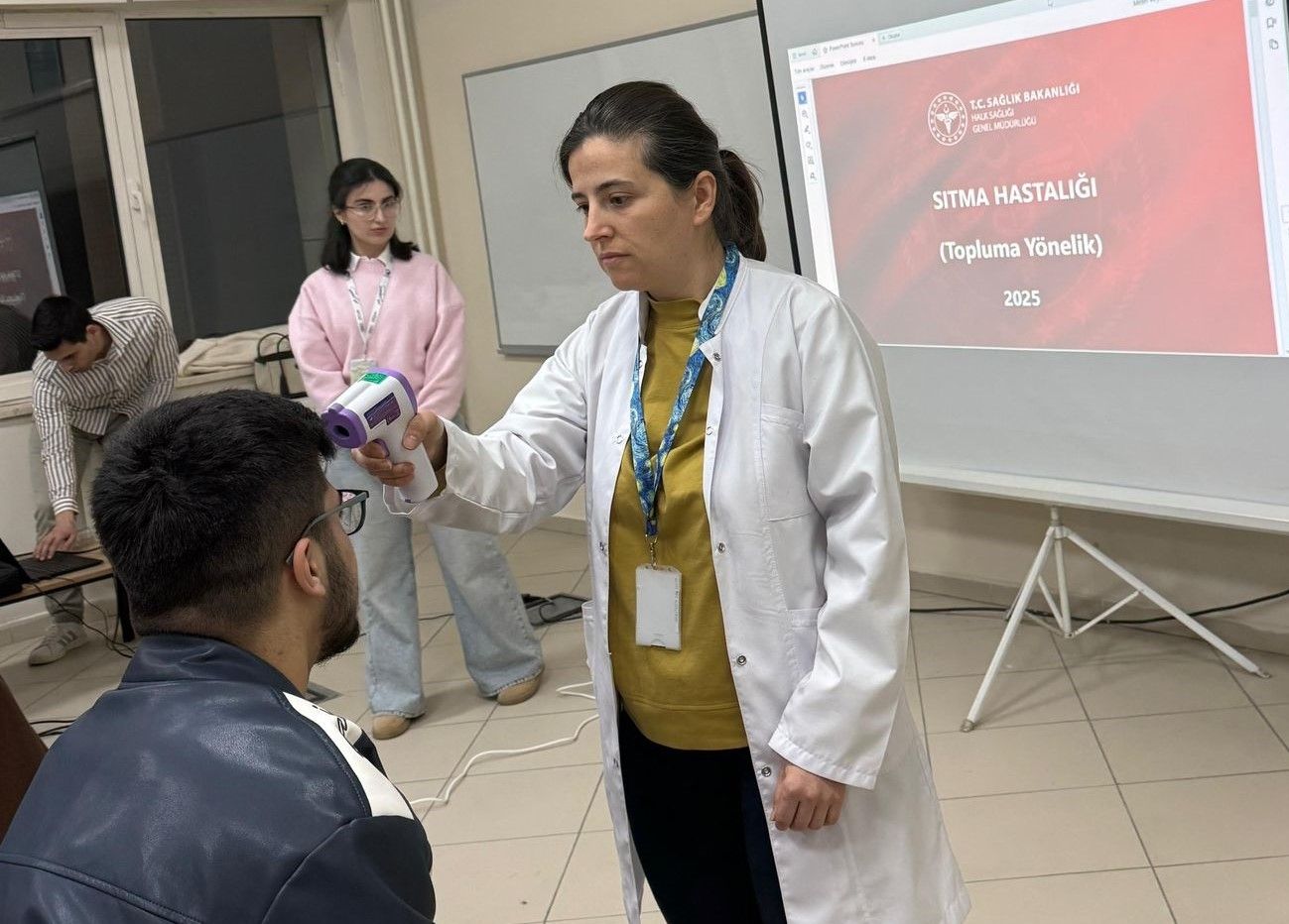 Düzce’nin Akçakoca ilçesinde KYK Erkek Öğrenci Yurdu’nda düzenlenen eğitimde sıtmanın erken tanı ve tedavisinin önemi anlatıldı; program kapsamında öğrencilere ateş ölçümü de yapıldı.