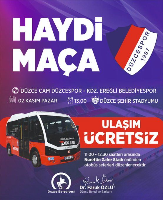 Bugün (2 Kasım Pazar) saat 13.00’te Düzce Şehir Stadı’nda oynanacak maç öncesinde, 11.00 – 12.30 saatleri arasında Nurettin Zafer Stadı önünden stadyuma ücretsiz otobüs seferleri düzenlenecek.