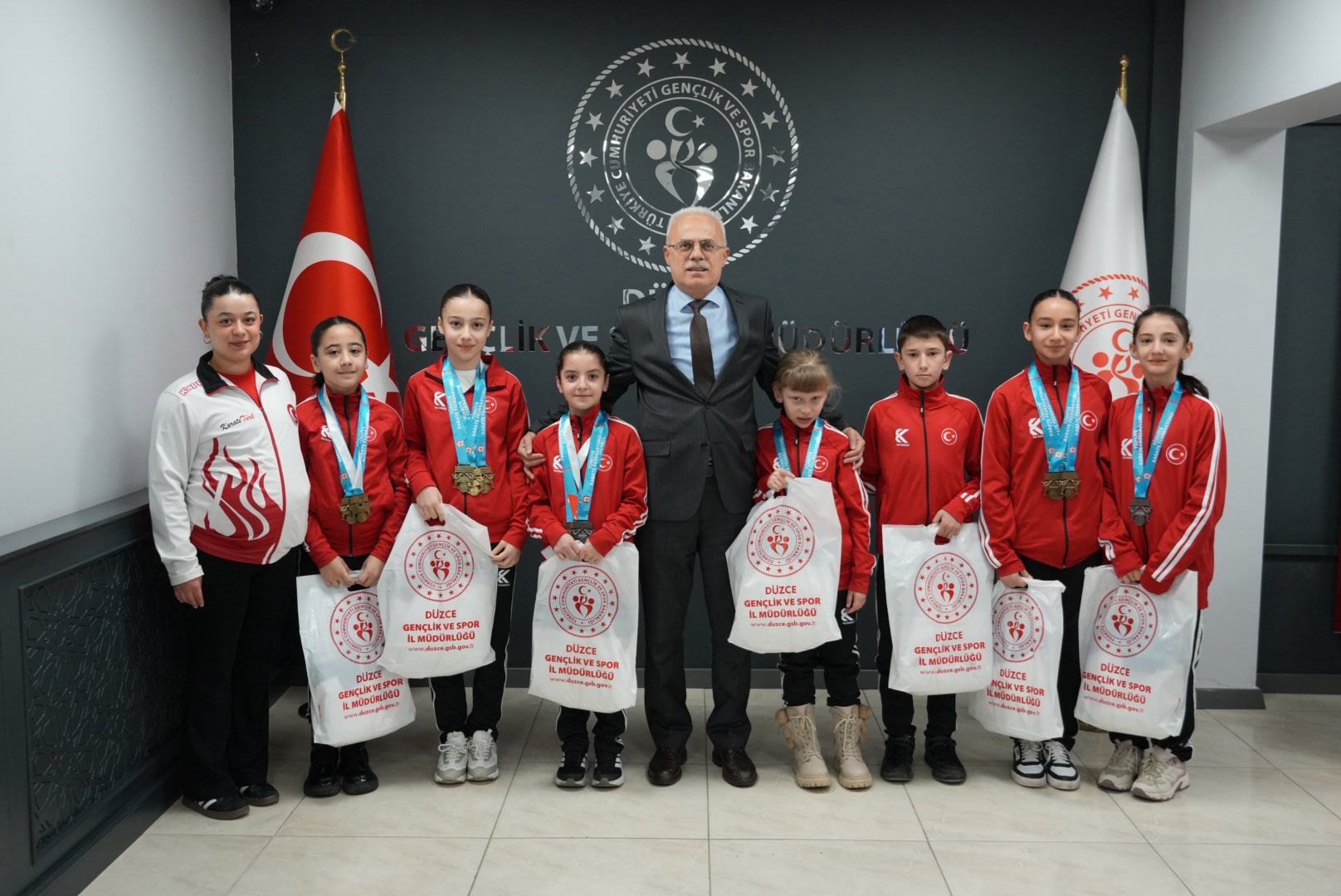 Türkiye Spor Toto Yıldızlar Ligi Karate müsabakalarında elde ettikleri birincilikler ile ilimize altın madalyalar kazandıran başarılı sporcular,Düzce Gençlik ve Spor İl Müdürümüz Zekeriya Arslantürk’ü makamında ziyaret etti.