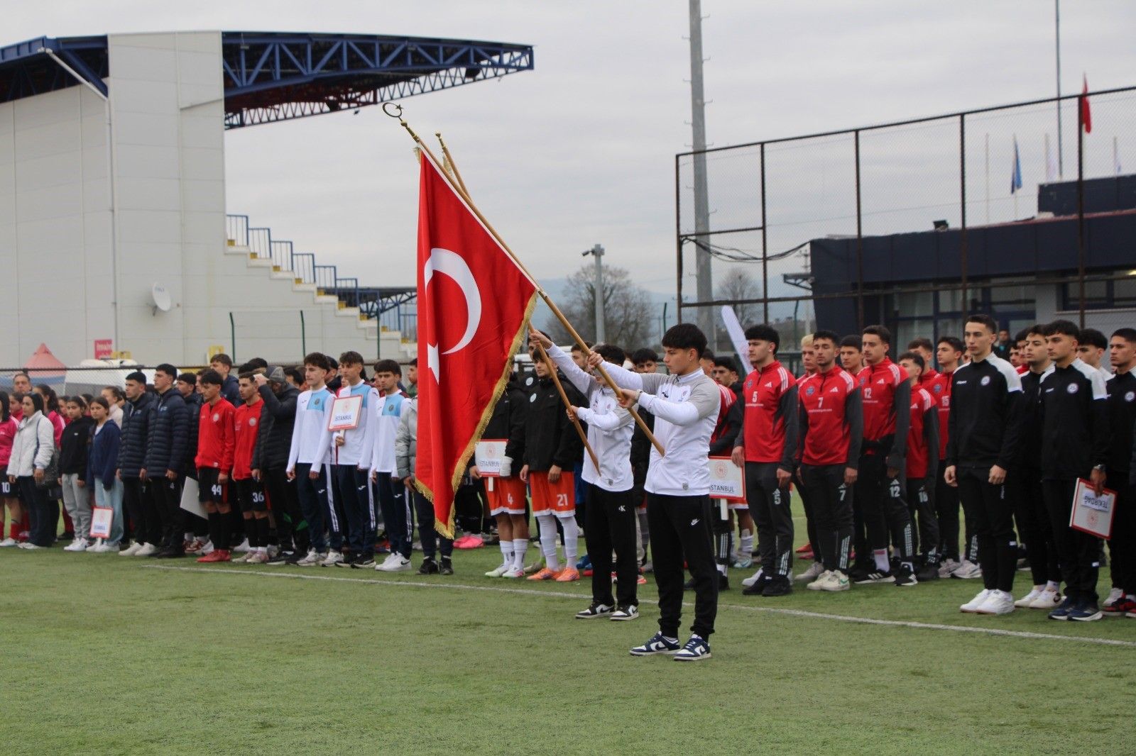 Düzce’nin ev sahipliğinde 2025-2026 Okul Sporları Futbol Gençler Grup müsabakaları, Şıralık Şehir Stadı’nda düzenlenen seremoninin ardından başladı.