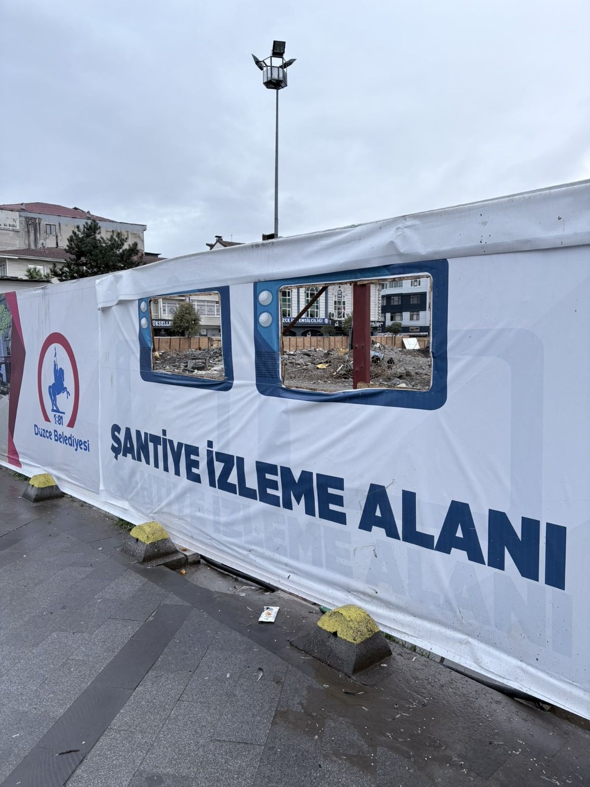 Düzce’nin Cedidiye Mahallesi’nde bulunan Düzce Belediyesi hizmet binasının yıkım çalışmaları devam ederken, sürecin izlenebilmesi amacıyla belediye ekipleri tarafından alana kurulan şantiye izleme alanı dikkat çekiyor.