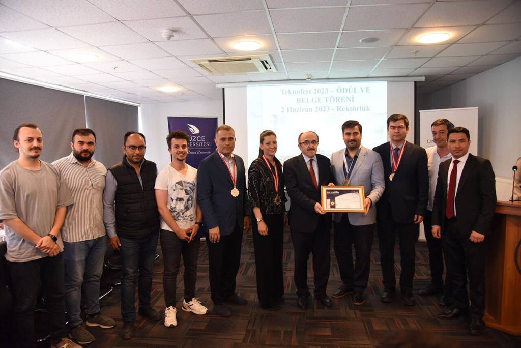 Rektörlük Çalıştay Salonu’nda gerçekleştirilen programda; İstanbul Uluslararası Buluş Yarışması’na (ISIF'23) Fibrobeton Yapı Elemanları San. İnş. Tic. A.Ş. firmasının ticarileştirme faaliyetlerine olan destekleri ile katılan, 1 Altın ve 3 Bronz madalya kazanan Düzce Üniversitesi, Düzce Teknopark ve Düzce TTO mensuplarına; Teknofest Thy Travel Hackathon kategorisinde, “Kullanıcılara Seyahatlerinin Tüm Planlamasını Yapan, THY Servis ve Hizmetleriyle Entegreli Yapay Zeka Botu” ile birinci olan PushUP AI öğrenci takımına ve Robotaksi Binek Otonom Yarışması Özgün Araç kategorisinde, 3. olarak En İyi Takım Ruhu Ödülü kazanan Mekatek takımına ödülleri, Düzce Üniversitesi Rektörü Prof. Dr. Nedim Sözbir, Rektör Yardımcıları Prof. Dr. İlhan Genç ve Prof. Dr. Abdullah Taşkesen tarafından takdim edildi.