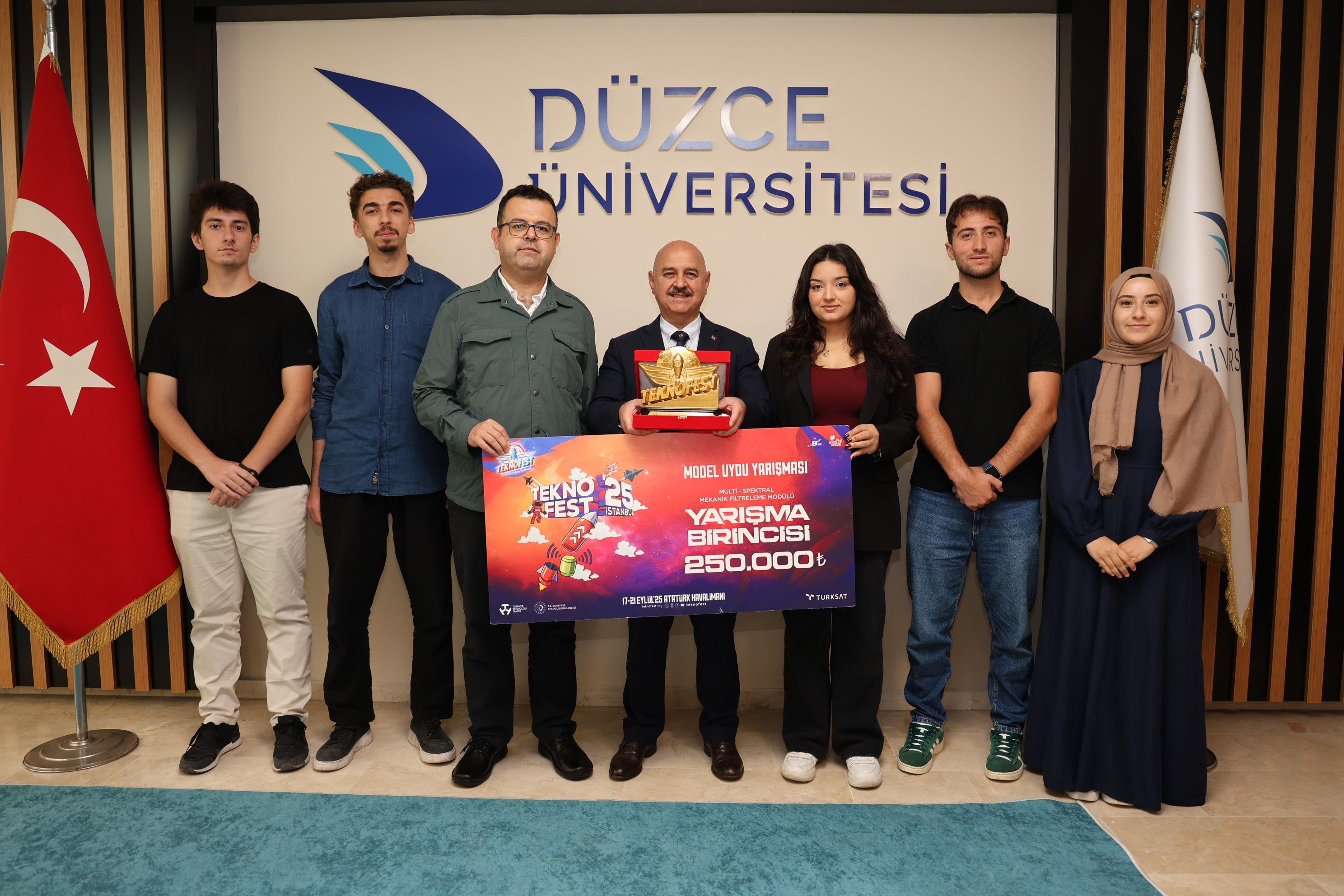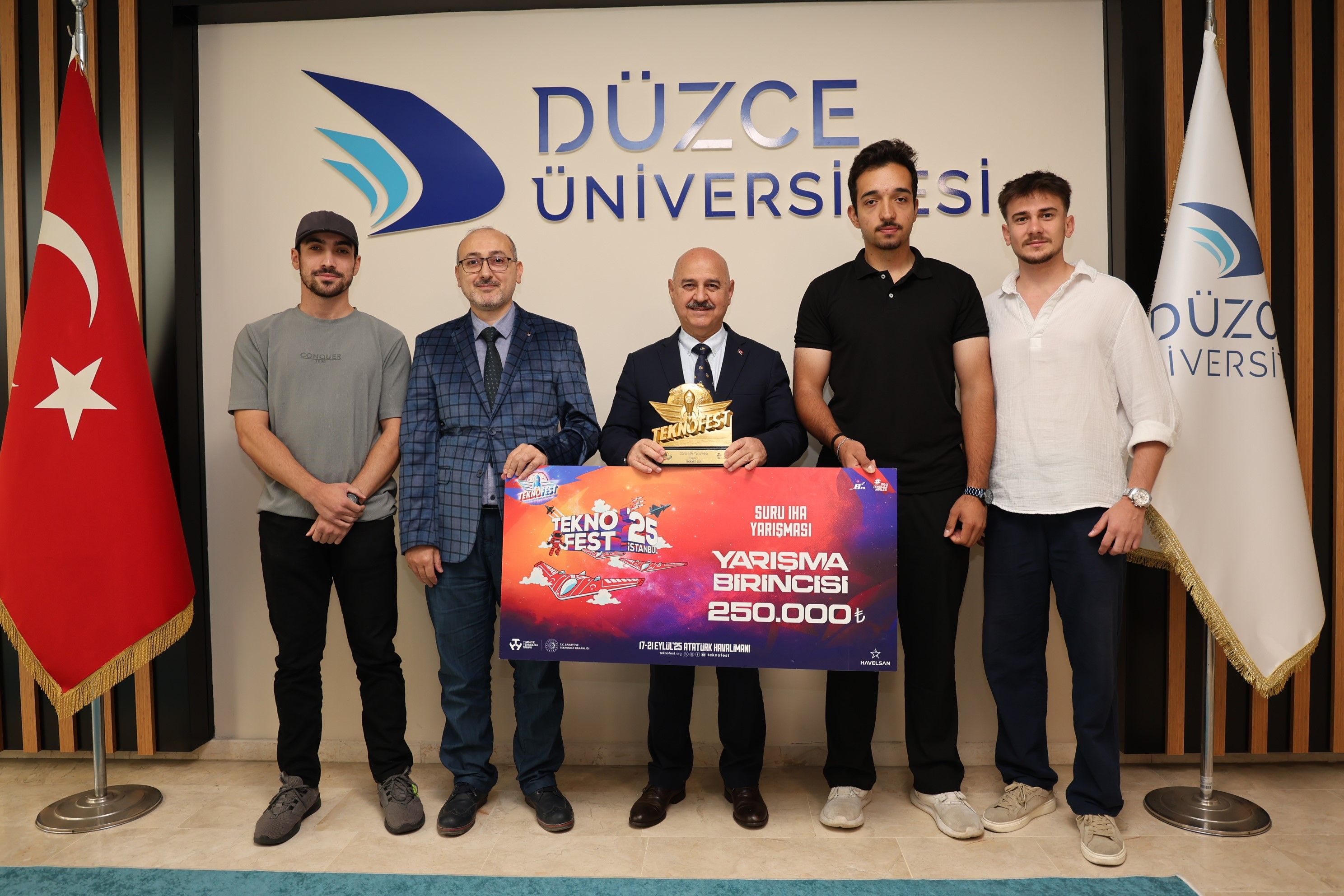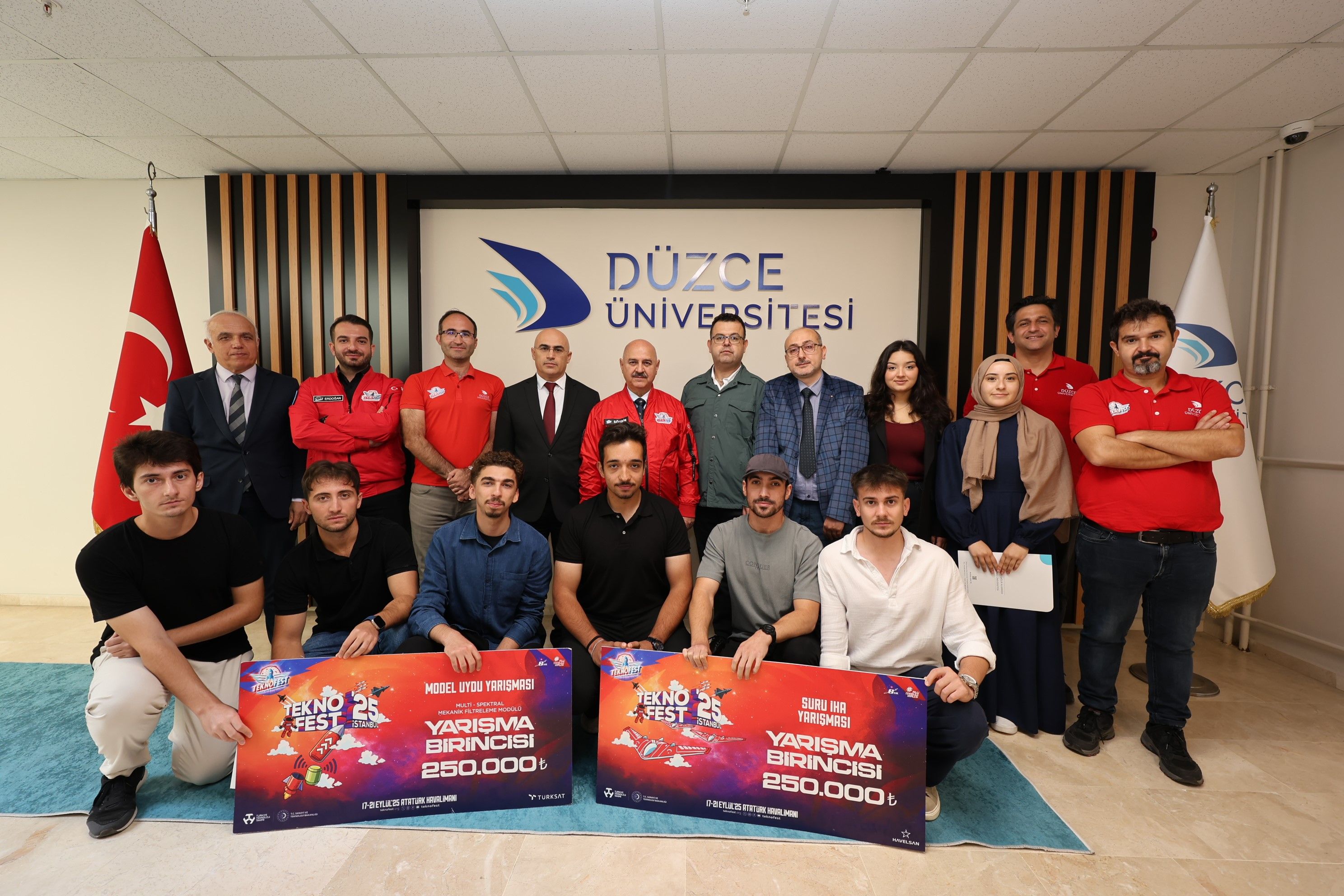 Türkiye Teknoloji Takımı Vakfı (T3 Vakfı) ile T.C. Sanayi ve Teknoloji Bakanlığı öncülüğünde bu yıl 11. kez düzenlenen Türkiye'nin en büyük havacılık, uzay ve teknoloji festivali TEKNOFEST 2025'te, Düzce Üniversitesi öğrencileri iki ayrı kategoride Türkiye birinciliği elde etmiş, ödüllerini Cumhurbaşkanı Recep Tayyip Erdoğan'ın ellerinden almanın gururunu yaşamıştı.