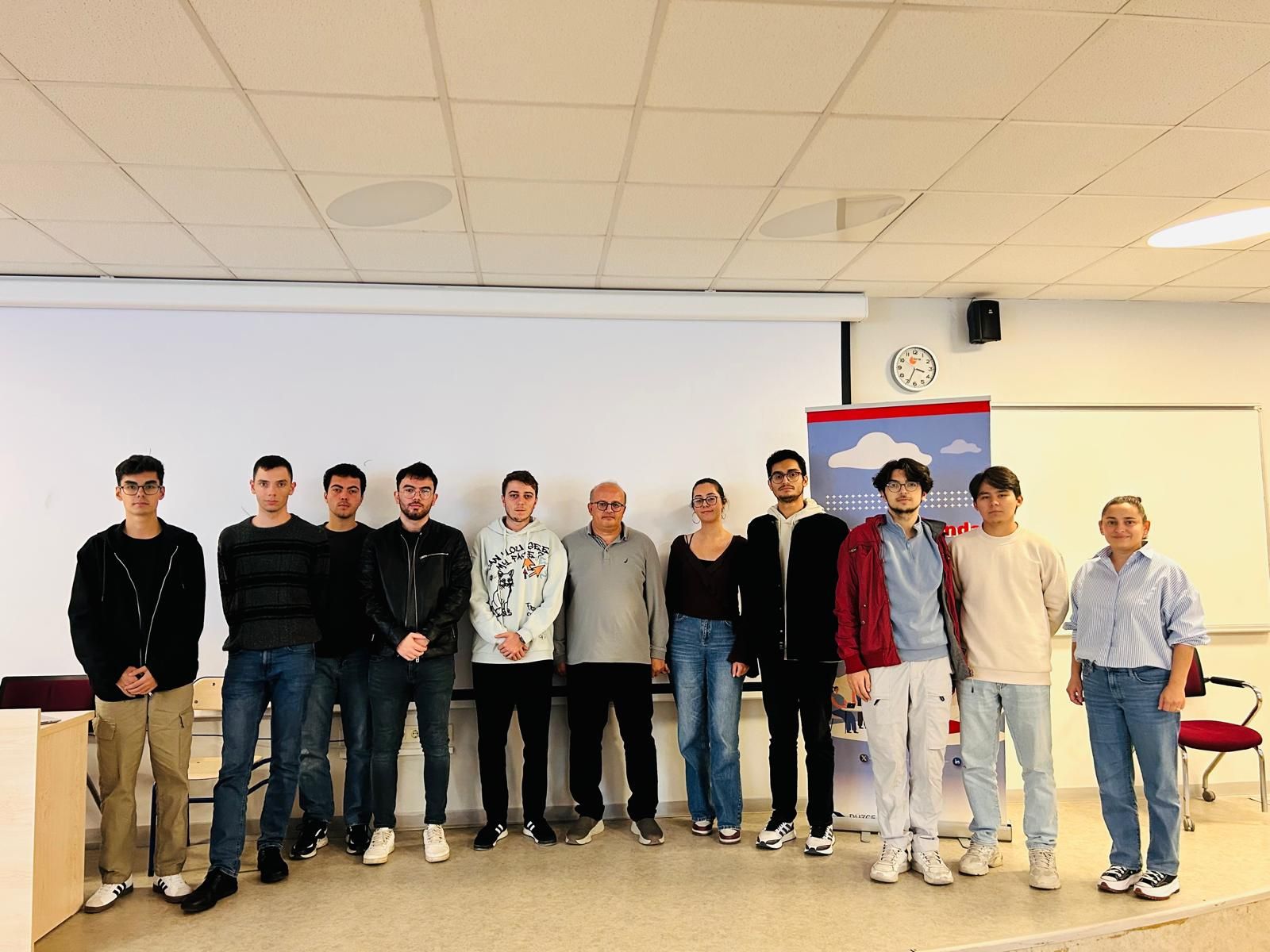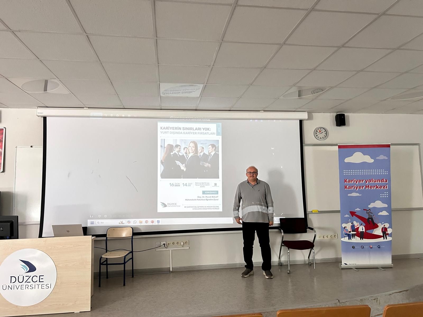 Etkinliğe konuşmacı olarak katılan Düzce Üniversitesi Mühendislik Fakültesi Öğretim Üyesi Doç. Dr. Murat Bulut, öğrencilere yurt dışında eğitim ve kariyer olanakları hakkında kapsamlı bilgiler aktardı. Doç. Dr. Murat Bulut, kendi akademik ve profesyonel deneyimlerinden yola çıkarak uluslararası kariyer planlaması sürecinde dikkat edilmesi gereken konulara değindi.