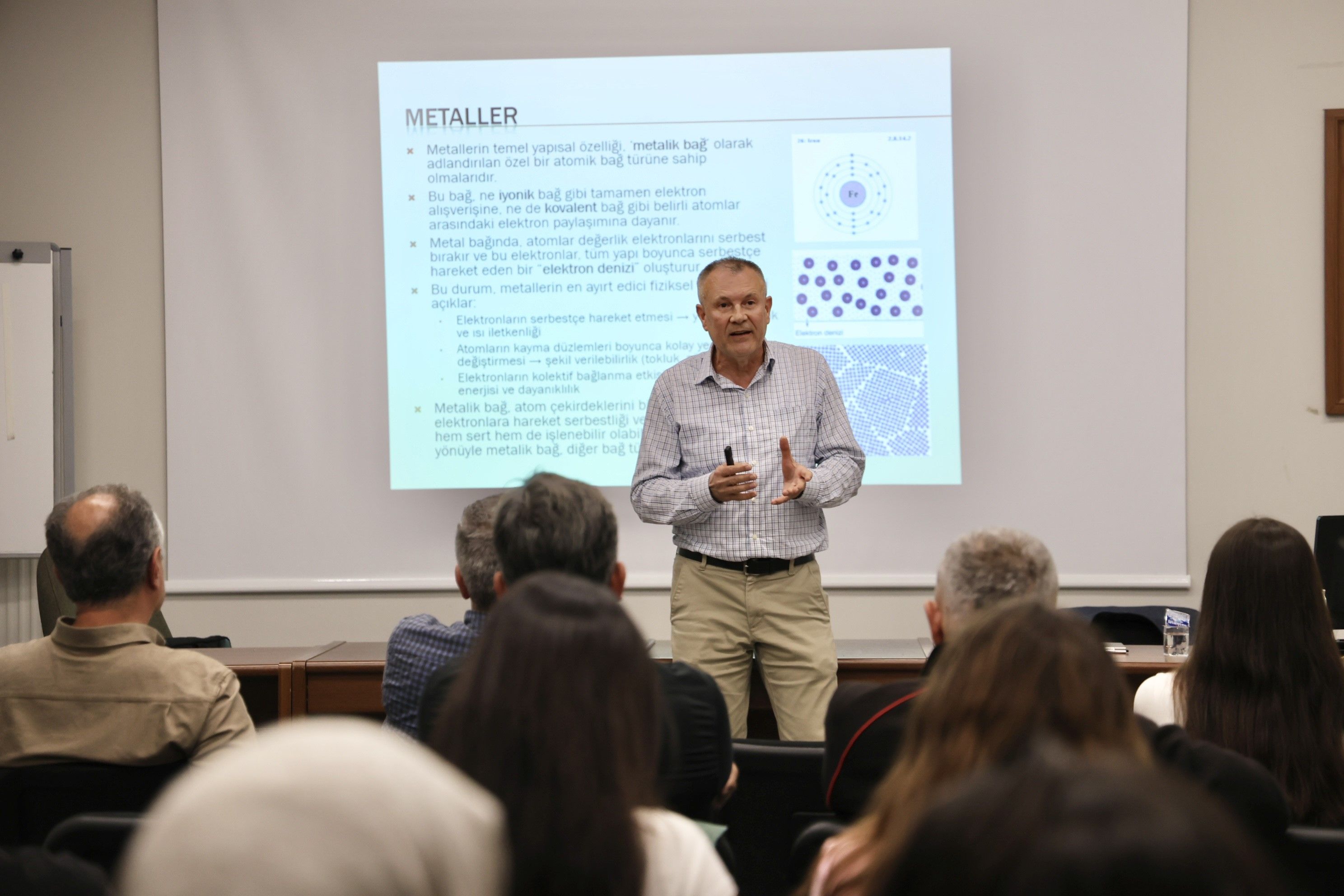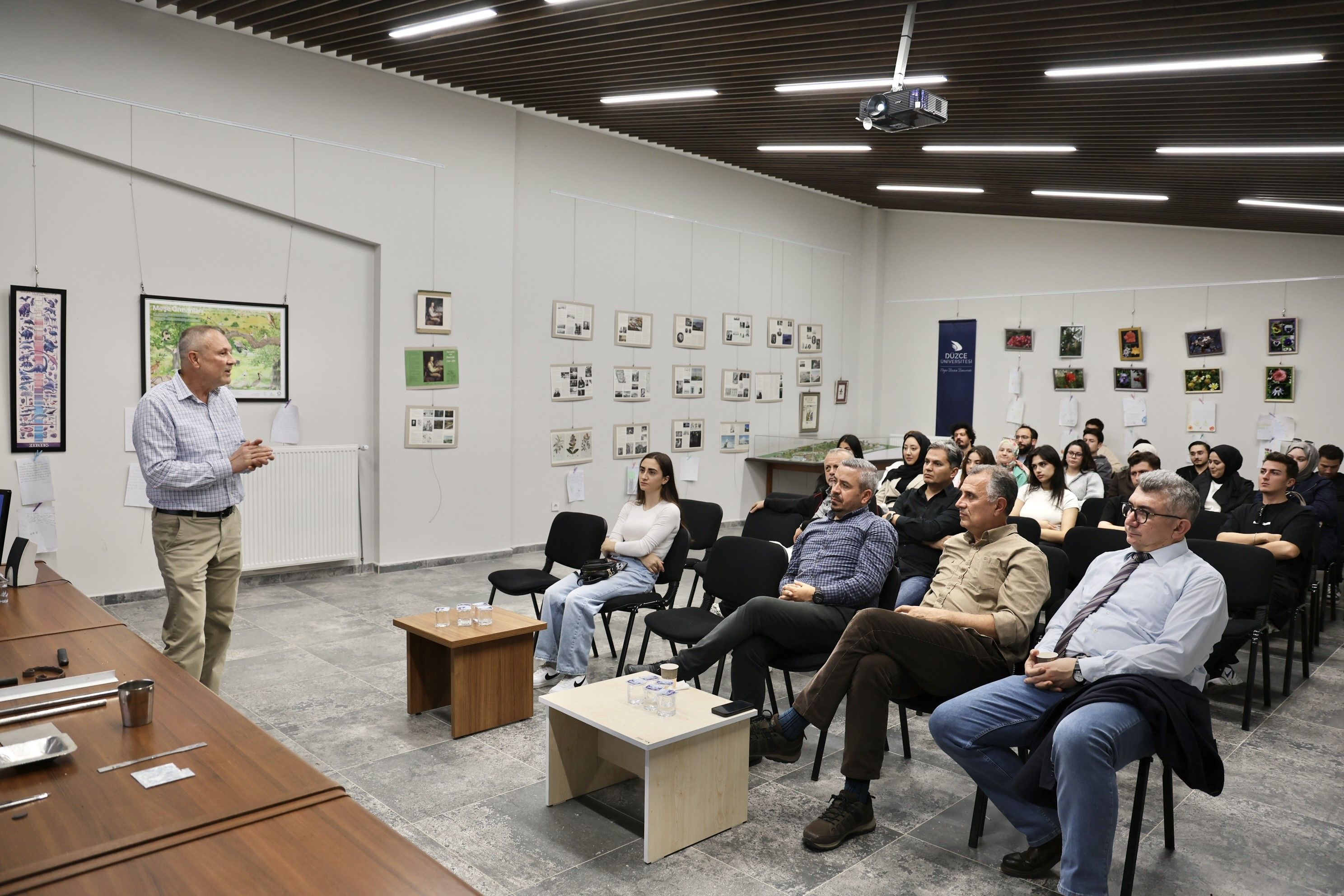 Konferansa; DÜSTİBAM Müdür Yardımcısı Prof. Dr. Engin Eroğlu, akademisyenler ve öğrenciler katılım sağlarken; Mühendislik Fakültesi Makine Mühendisliği Bölümü Öğretim Üyesi Prof. Dr. Oktay Elkoca, "Bahçe Uygulamalarında Metalik Malzemelerin Kullanımı" başlıklı konuşmasıyla etkinlikte yer aldı. Bahçe tasarımında malzeme seçiminin bir mekanın karakterini belirleyen temel unsurlardan biri olduğunu vurgulayarak konuşmasına başlayan Oktay Elkoca; bitkilerin doğallığı, yumuşaklığı ve değişkenliğine karşılık metal, taş ve ahşap gibi yapısal malzemelerin bu doğallığa denge, düzen ve kalıcılık kattığını ifade etti. Metalin estetik ve işlevsel açıdan bahçelerde üstlendiği güçlü rolü örneklerle ele alan Elkoca, paslanmaz çeliğin parlak yüzeyiyle modern bir kontrast oluşturduğunu, corten çeliğin sıcak pas tonlarının mekana derinlik kattığını, alüminyumun ise hafifliğiyle zarif bir görünüm sağladığını dile getirdi.