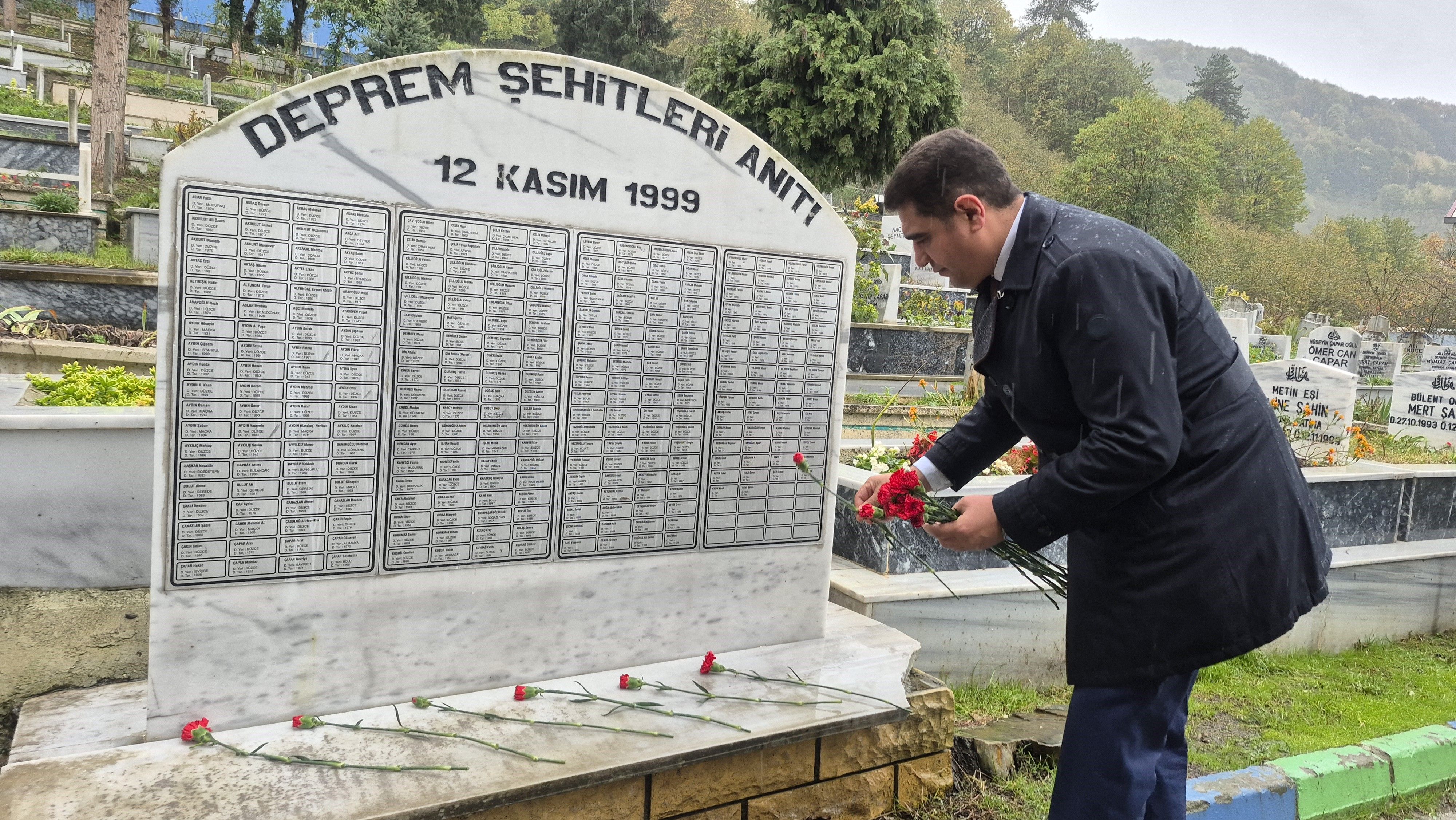 Vali Selçuk Aslan, Düzce depreminde yaşanan bazı olayları halen hatırladığını belirterek "12 Kasım 1999 tarihinde saatler 18:57'yi gösterirken 17 Ağustos'un üzerinden henüz daha 3 ay geçmeden 7.2 büyüklüğünde merkez üstü Kaynaşlı ilçemiz olan yabancı bir basın kuruluşunun attığı manşette Türkiye kıyameti yaşadı hafızamdadır taze olarak bu deprem acısının 26. yıl dönümünü idrak ediyoruz. Bu deprem maalesef 316'sı Kaynaşlı ilçemizden olmak üzere 845 kardeşimizi, annemizi, babamızı, komşumuzu yani kısaca canımızı sevdiklerimizi bizlerden ayırdı. Rabb'im hepsinin mekanını cennet eylesin hepsine Allah'tan rahmet diliyorum. Bu sayının nerdeyse 3 katından fazla da yaralımız söz konusu tabii ki hayat orda durmadı. Hayat devam etti geldiğimiz noktada devletimizin güçlü desteği müşfik politikaları ve Düzce'nin azmiyle Düzce'de Kaynaşlı'da sendelediği yerden bugün yeniden ayağa kalktı. Bu büyük acının üzerine Düzce vilayet oldu yaralarını çok daha hızlı sarabilmesi için. Bu acı hala yüreklerimizi andıkça sızlatıyor. Özellikle daha yakın şekilde tanışlarını akrabalarını kaybeden insanlar açısından belki son nefese kadar da devam edecek bir sızı. Ancak ifade ettiğim gibi hayat orda durmadı hayat devam ediyor. Yaşadıklarımızdan güçlü dersler çıkartmamız gerekli tekrar aynı sıkıntılara düşmememiz gerekli. Çünkü afetler özellikle de deprem Türkiye'nin büyük bir gerçeği. Bizler afetlerle özellikle de depremle yaşamak zorundayız güzel bir söz var deprem değil binalar insanlara zarar vermekte. Bu minvalde ilmin bize gösterdiği imkanları en güçlü şekilde kullanarak şehirlerimizi mukavemetli şekilde dirençli şekilde inşa etmek zorundayız. Kendimize yuva bildiğimiz meskenlerimizi hayatımızı idam ettirmek noktasında kullandığımız ticari hanelerimizi iş yerlerimizi ilmin ön gördüğü mühendisliğin emrettiği hususlara göre yaparsak afetler gerçeğimiz olmakla beraber bizler açısından yıkıcı sonuçlar acı sonuçlar bırakmaktan uzaklaşacaktır. Ben tekrar gerek 12 Kasım 1999 depreminde Düzce'de gerekse farklı afetlerde yitirdiğimiz canlarımıza Allah'tan rahmet diliyorum. Hepsinin mekanı cennet olsun. 20 şehidimizin haberini dün aldık. Bugün bir kısmı belki uğurlanacak. Tüm şehitlerimize Allah'tan rahmet diliyorum mekanları cennet olsun ailelerine başsağlığı diliyorum milletimizin başı sağ olsun" dedi.