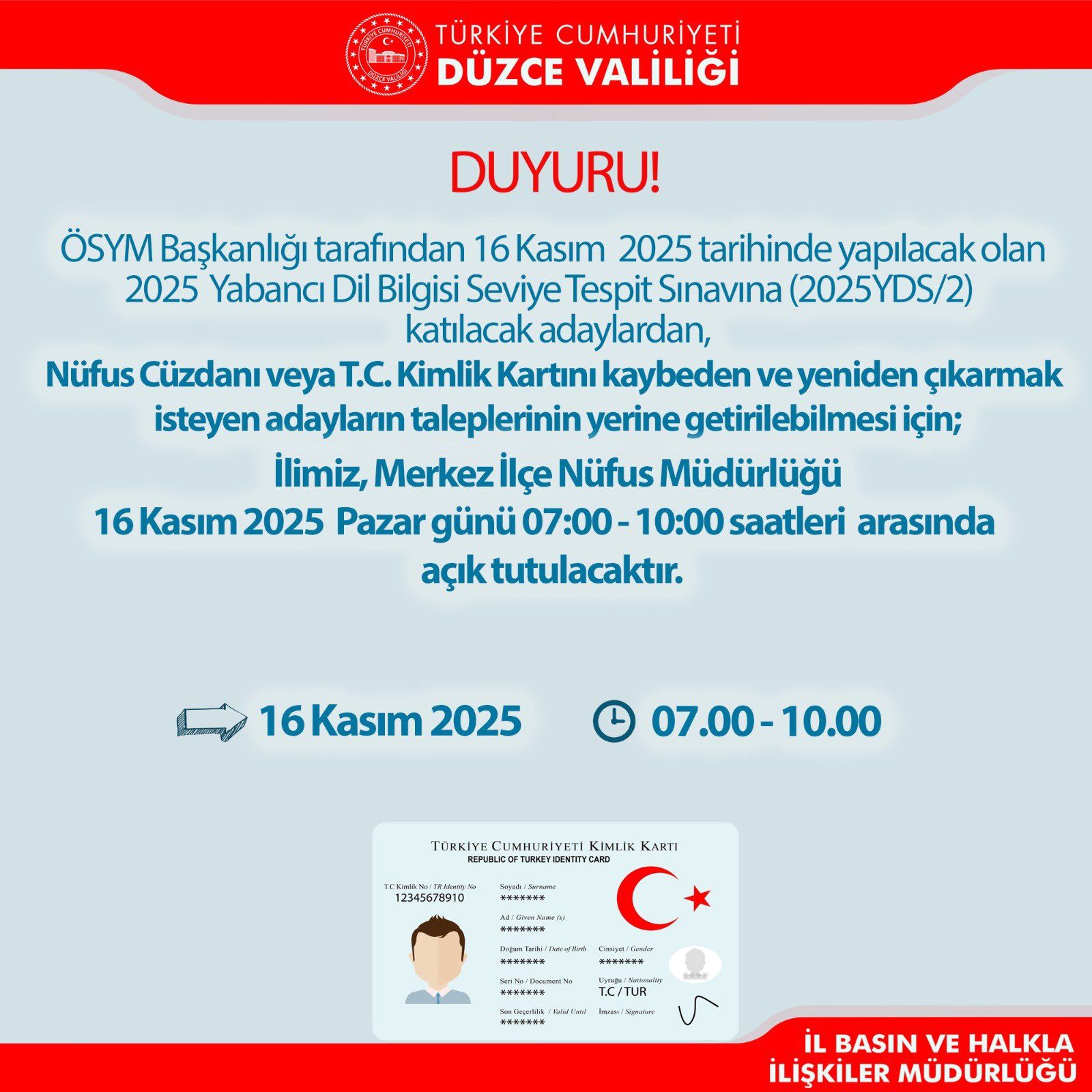 Bu kapsamda, Düzce Merkez İlçe Nüfus Müdürlüğü 16 Kasım 2025 Pazar günü 07.00 – 10.00 saatleri arasında açık olacak ve adayların kimlik kartı taleplerini yerine getirecek.